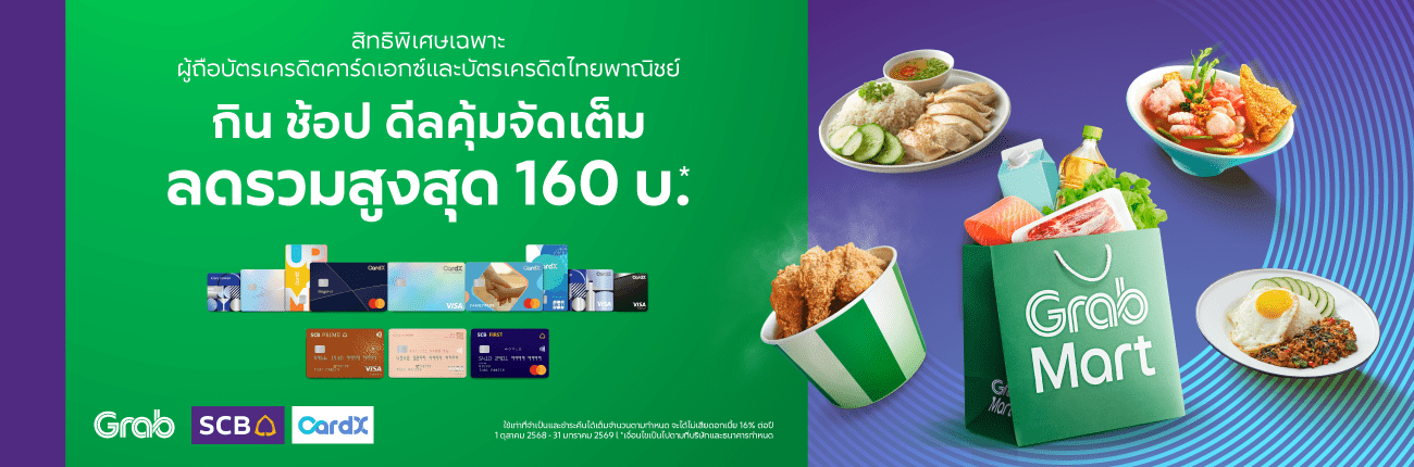 - Consumers must fill CARDXFOOD in the promotion code field and choose GrabPay as payment method using CardX Credit Card & SCB Credit Card before placing the food order.