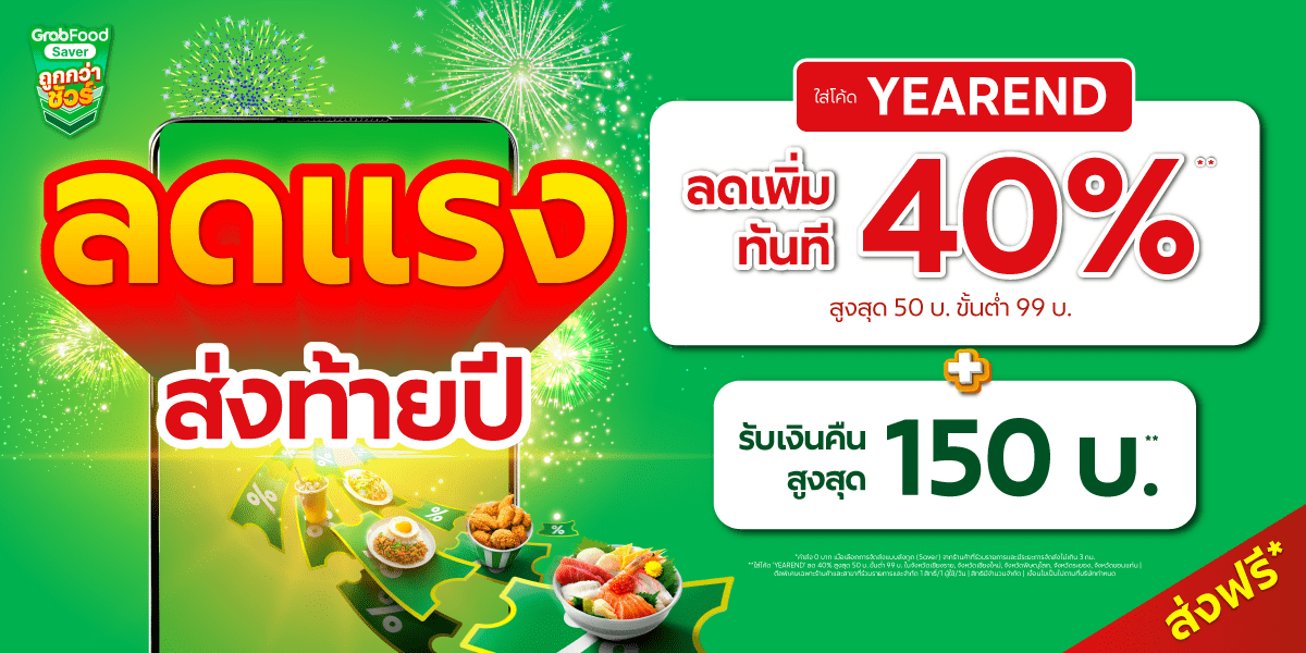 - เมื่อใส่โค้ด YEAREND และทำการสั่งซื้อสำเร็จ จะได้รับส่วนลดในการสั่งครั้งถัดไป มูลค่าสูงสุด 150 บาท โดยมีรายละเอียดดังนี้ : ส่วนลด 20% สูงสุด 50 บาท ขั้นต่ำ 120 บาท จำกัด 3 สิทธิ์ / ผู้ใช้ตลอดระยะเวลาแคมเปญ