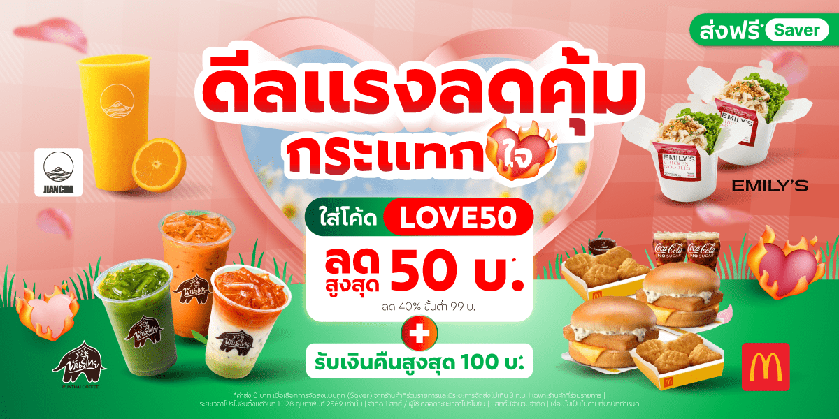 • รหัสส่วนลด LOVE50 ลด 40% สูงสุด 50 บาท ขั้นต่ำ 99 บาท สำหรับร้านค้าและสาขาที่ร่วมรายการ  มีจำนวนจำกัด ต้องกรอกในขั้นตอนการชำระเงิน จำกัด 1 สิทธิ์ / ผู้ใช้ตลอดระยะเวลาแคมเปญ