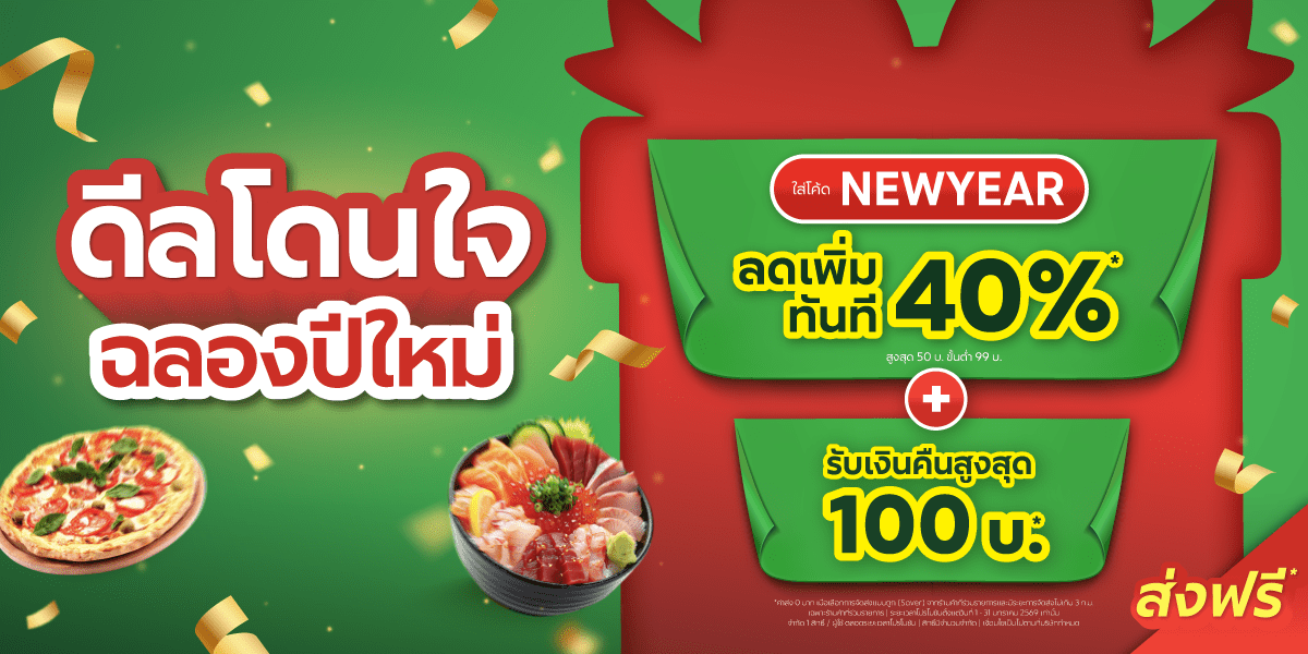 - รหัสส่วนลด NEWYEAR ลด 40% สูงสุด 50 บาท ขั้นต่ำ 99 บาท สำหรับร้านค้าและสาขาที่ร่วมรายการ มีจำนวนจำกัด ต้องกรอกในขั้นตอนการชำระเงิน จำกัด 1 สิทธิ์ / ผู้ใช้ตลอดระยะเวลาแคมเปญ
