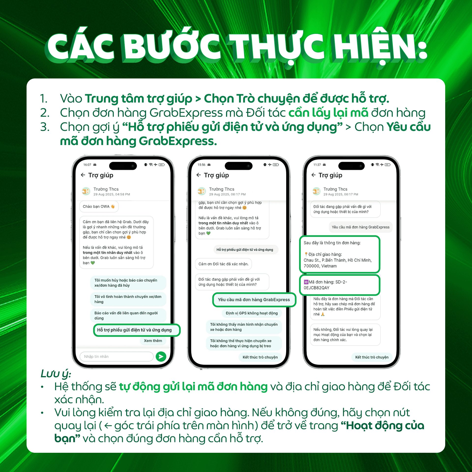 HƯỚNG DẪN THAO TÁC YÊU CẦU CẤP LẠI MÃ ĐƠN HÀNG GRABEXPRESS MỤC TRUNG TÂM TRỢ GIÚP TRÊN ỨNG DỤNG GRAB DRIVER