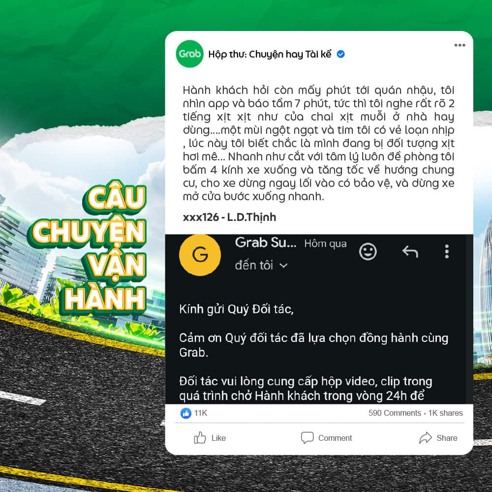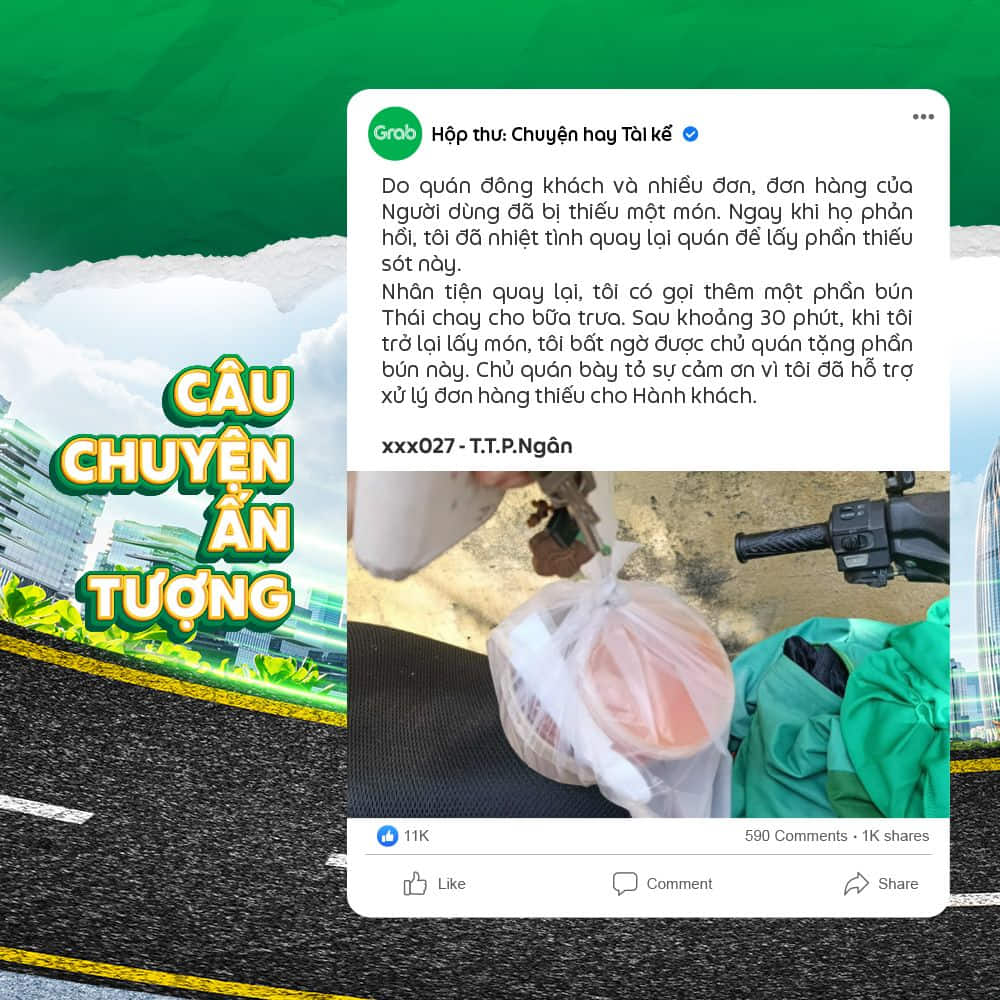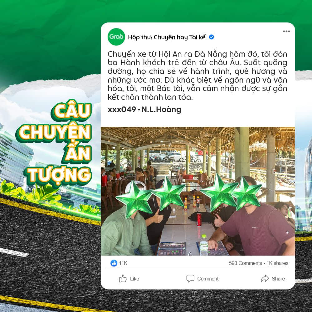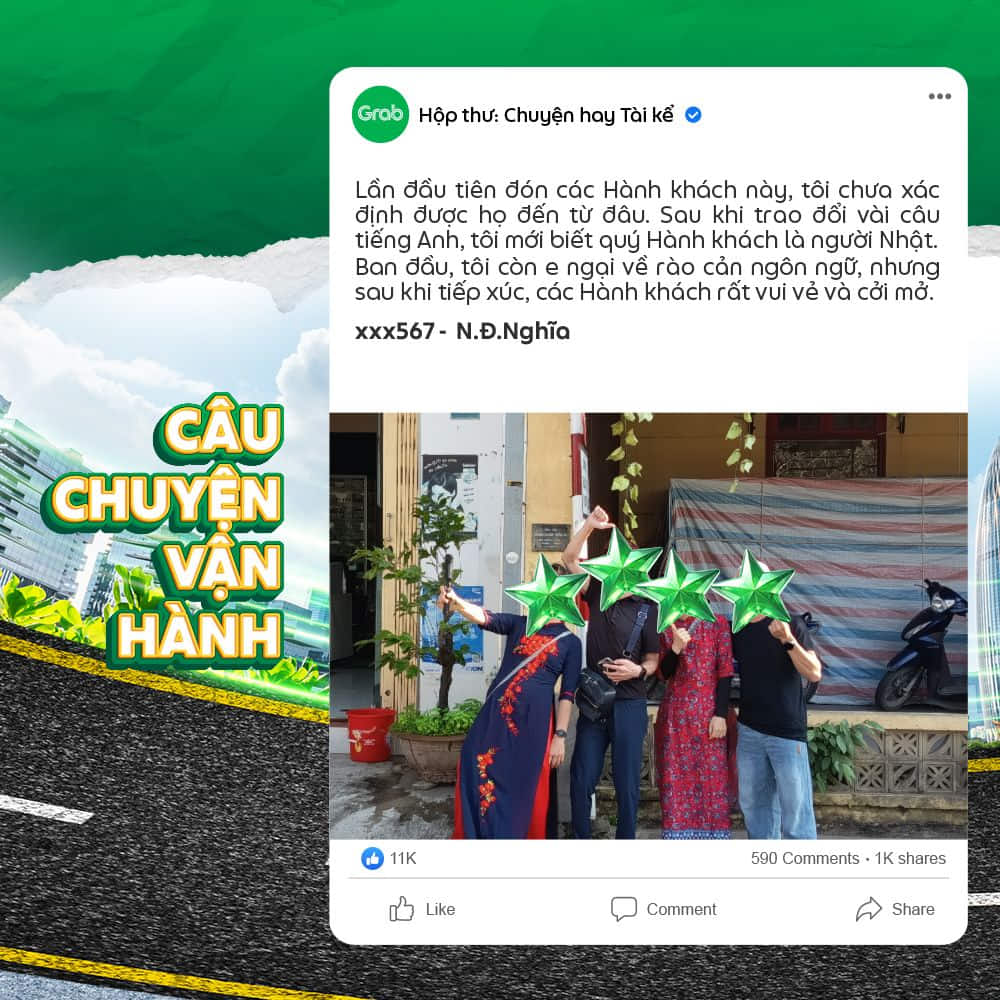 👉 Trong trường hợp các câu chuyện mà Đối tác gửi về có hình ảnh liên quan quá nhiều đến bên thứ 3 (hình cận mặt, địa chỉ, thông tin cá nhân,…) Grab sẽ ghi nhận và thay thế bằng hình minh họa khác.