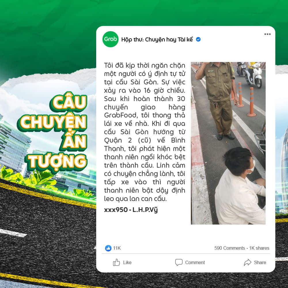 Tôi đã kịp thời ngăn chặn một người có ý định tự tử tại cầu Sài Gòn. Sự việc xảy ra vào 16 giờ chiều. Sau khi hoàn thành 30 chuyến giao hàng GrabFood, tôi thong thả lái xe về nhà. Khi đi qua cầu Sài Gòn hướng từ Quận 2 (cũ) về Bình Thạnh, tôi phát hiện một thanh niên ngồi khóc bệt trên thành cầu. Linh cảm có chuyện chẳng lành, tôi tấp xe vào thì người thanh niên bật dậy định leo qua lan can cầu.
