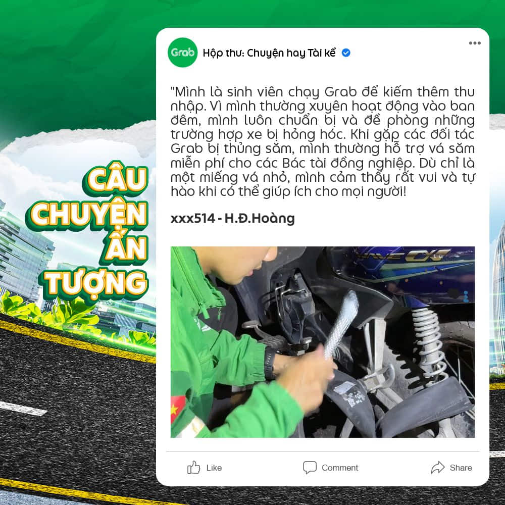 Mình là sinh viên chạy Grab để kiếm thêm thu nhập. Vì mình thường xuyên hoạt động vào ban đêm, mình luôn chuẩn bị và đề phòng những trường hợp xe bị hỏng hóc. Khi gặp các đối tác Grab bị thủng săm, mình thường hỗ trợ vá săm miễn phí cho các Bác tài đồng nghiệp. Dù chỉ là một miếng vá nhỏ, mình cảm thấy rất vui và tự hào khi có thể giúp ích cho mọi người!