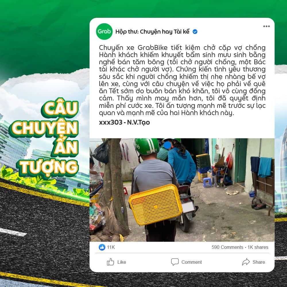Chuyến xe GrabBike Tiết Kiệm chở cặp vợ chồng Hành khách khiếm khuyết bẩm sinh mưu sinh bằng nghề bán tăm bông (tôi chở người chồng, một Bác tài khác chở người vợ). Chứng kiến tình yêu thương sâu sắc khi người chồng khiếm thị nhẹ nhàng bế vợ lên xe, cùng với câu chuyện về việc họ phải về quê ăn Tết sớm do buôn bán khó khăn, tôi vô cùng đồng cảm. Thấy mình may mắn hơn, tôi đã quyết định miễn phí cước xe. Tôi ấn tượng mạnh mẽ trước sự lạc quan và mạnh mẽ của hai Hành khách này.