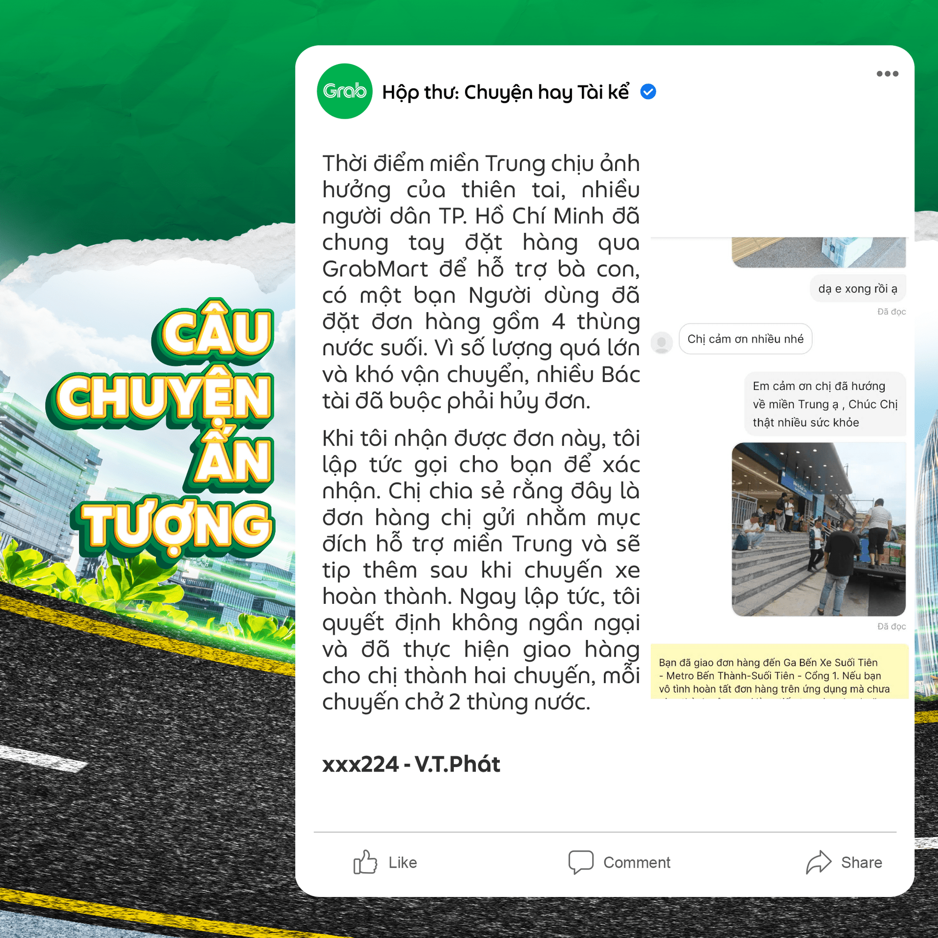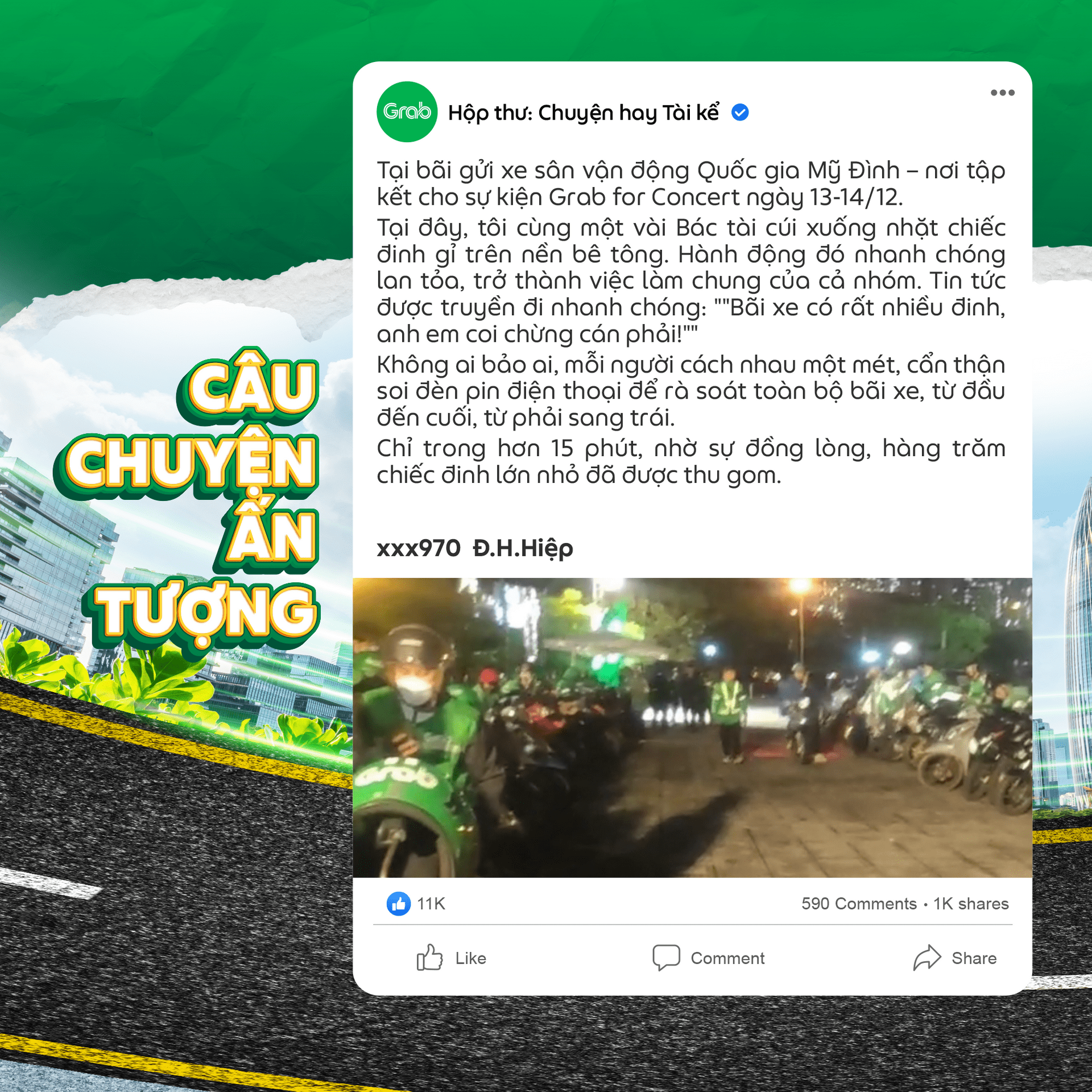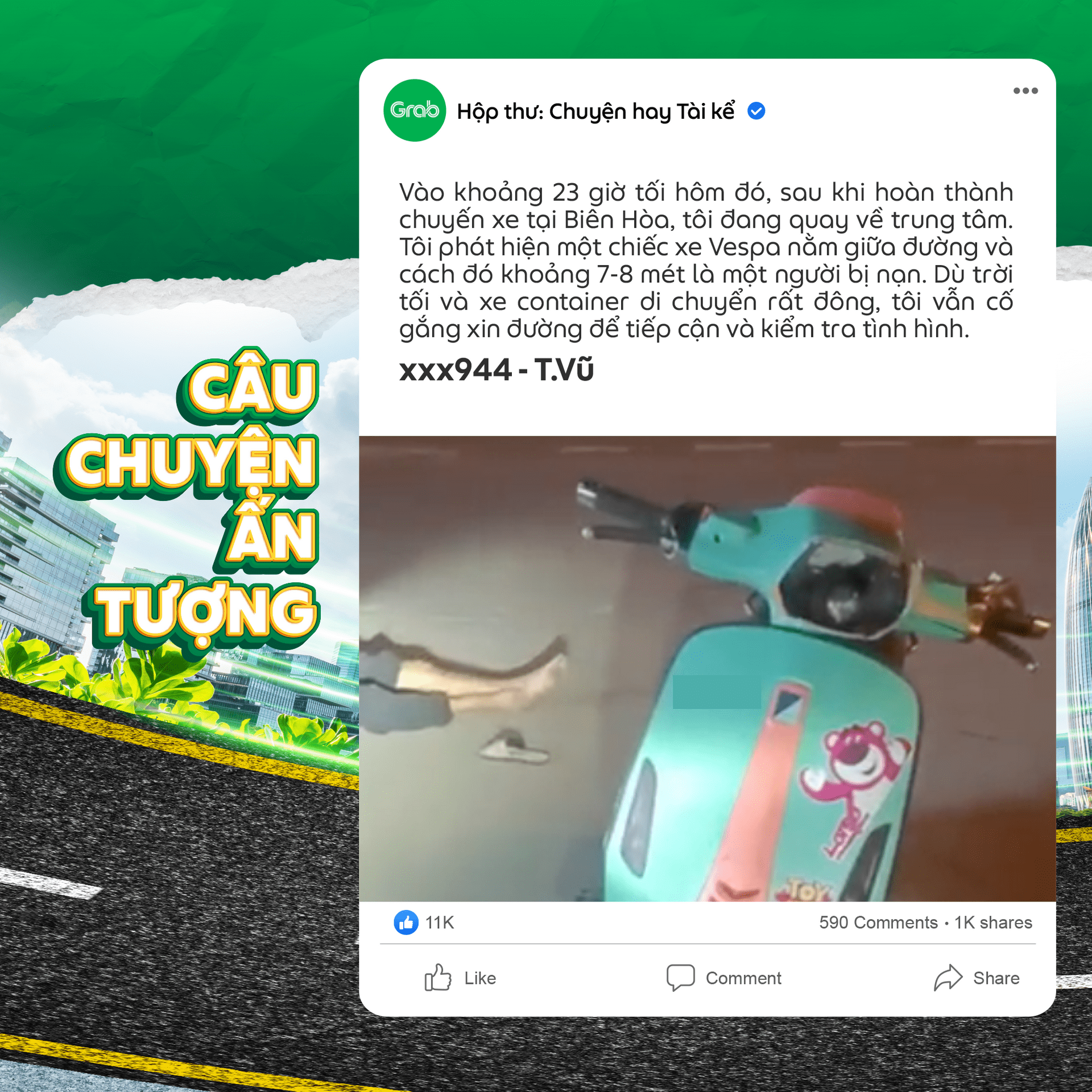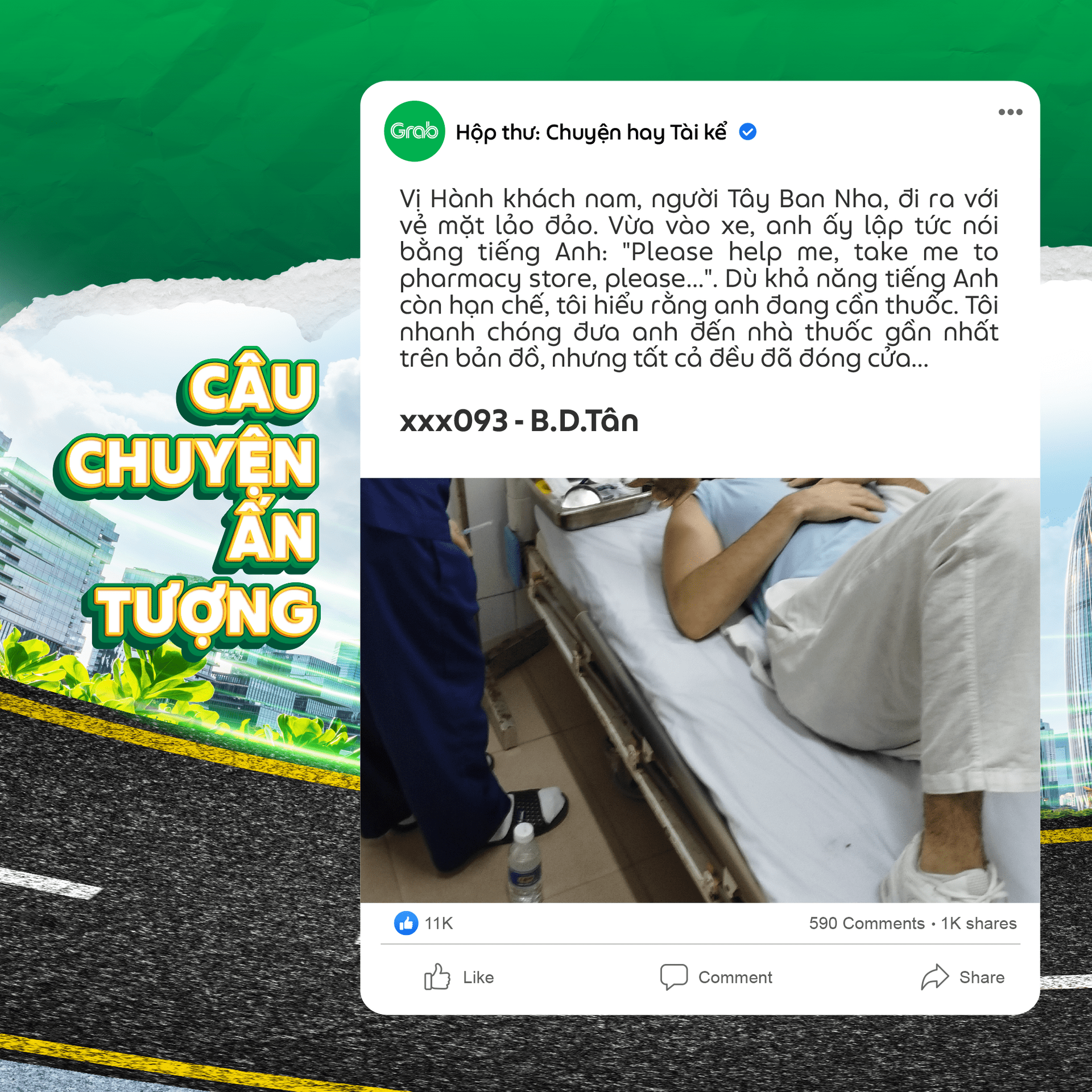 Qua đây, tôi xin gửi lời cảm ơn chân thành đến tất cả các Bác tài Grab đã hỗ trợ tôi và người bị nạn trong tình huống khẩn cấp đó.