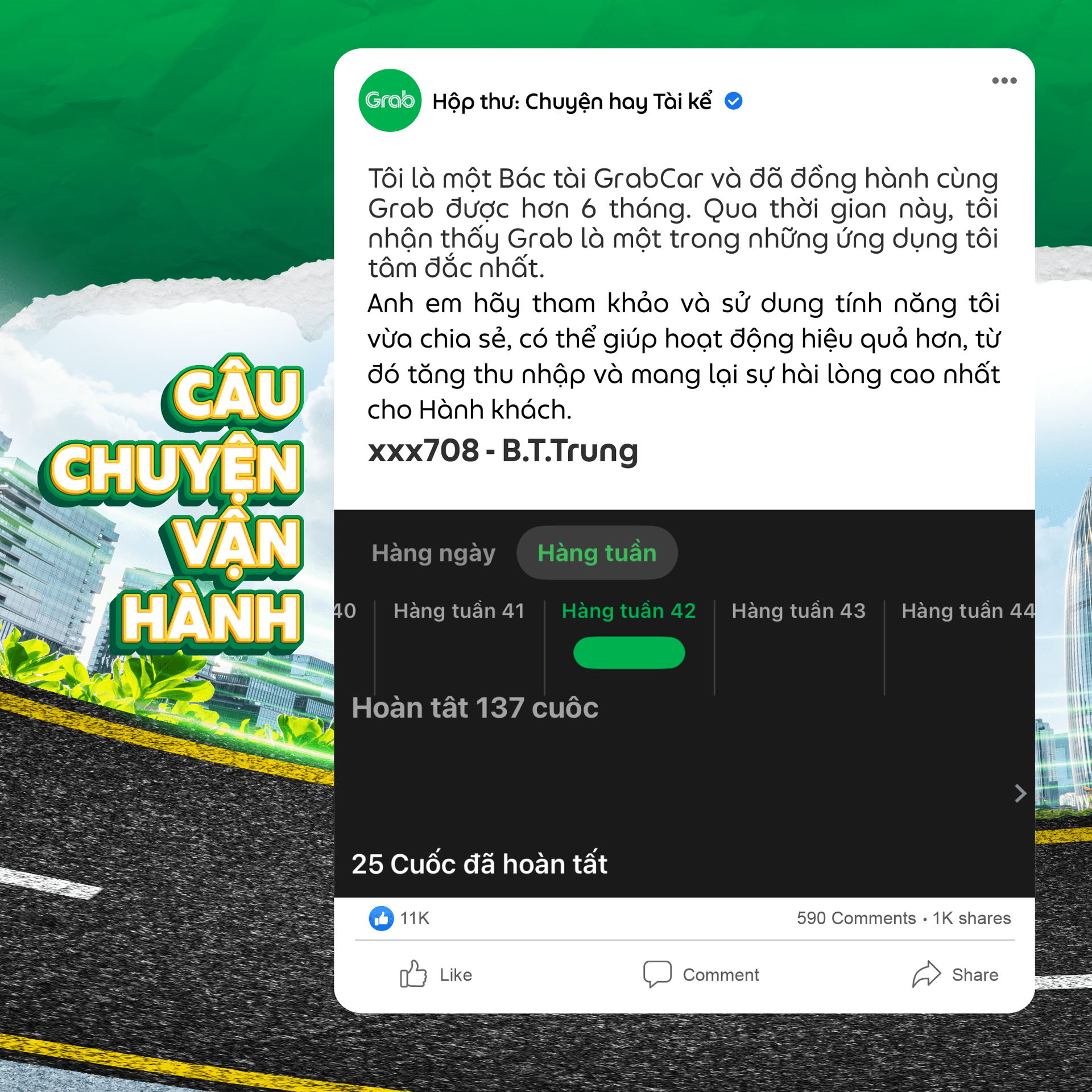 Giờ đây, hành trình ấy tiếp tục được mở rộng qua diện mạo mới mang tên Chương trình: Chuyện hay – Tài kể. Không chỉ là nơi lan tỏa những ⭐khoảnh khắc truyền cảm hứng, mùa này còn chính thức ra mắt 🛵 giải thưởng “Câu chuyện vận hành” – khuyến khích Đối tác chia sẻ các mẹo xử lý tình huống, kinh nghiệm hoạt động thực tế,… để cộng đồng Đối tác Grab cùng học hỏi và vận hành hiệu quả hơn mỗi ngày, từ đó mang đến chất lượng dịch vụ 5 sao và chuyên nghiệp cho Người dùng.