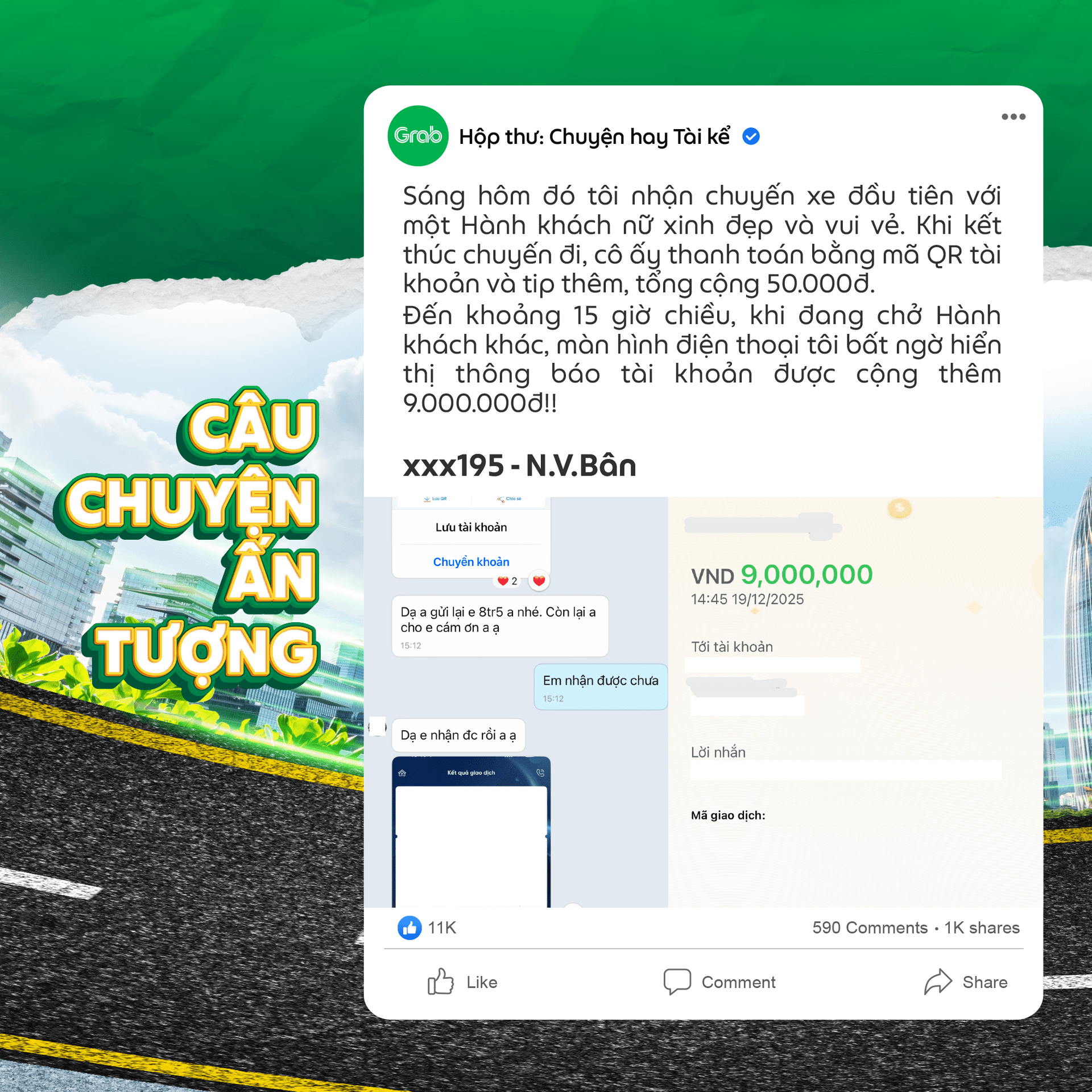 Sau khi kết thúc ba chuyến xe liên tiếp, tôi mới có thời gian xem xét. Tôi truy lục trên ứng dụng ngân hàng và xác nhận số tiền này được chuyển từ tài khoản của Hành khách nữ buổi sáng. Tôi lập tức tìm cách liên hệ lại,vào mục trợ giúp của ứng dụng Grab để nhờ nhân viên hỗ trợ kết nối thì thấy Hành khách lại chuyển tiếp 10.000đ vào số tài khoản tôi kèm lời nhắn: “Em vừa chuyển nhầm cho anh 9 triệu, anh có thể cho em xin lại được không”. Tôi mừng rỡ gọi lại, kết nối và nhanh chóng chuyển trả đủ số tiền. Đó là một ngày làm việc kết thúc trong niềm vui nhưng cũng đầy sự ngại ngùng.