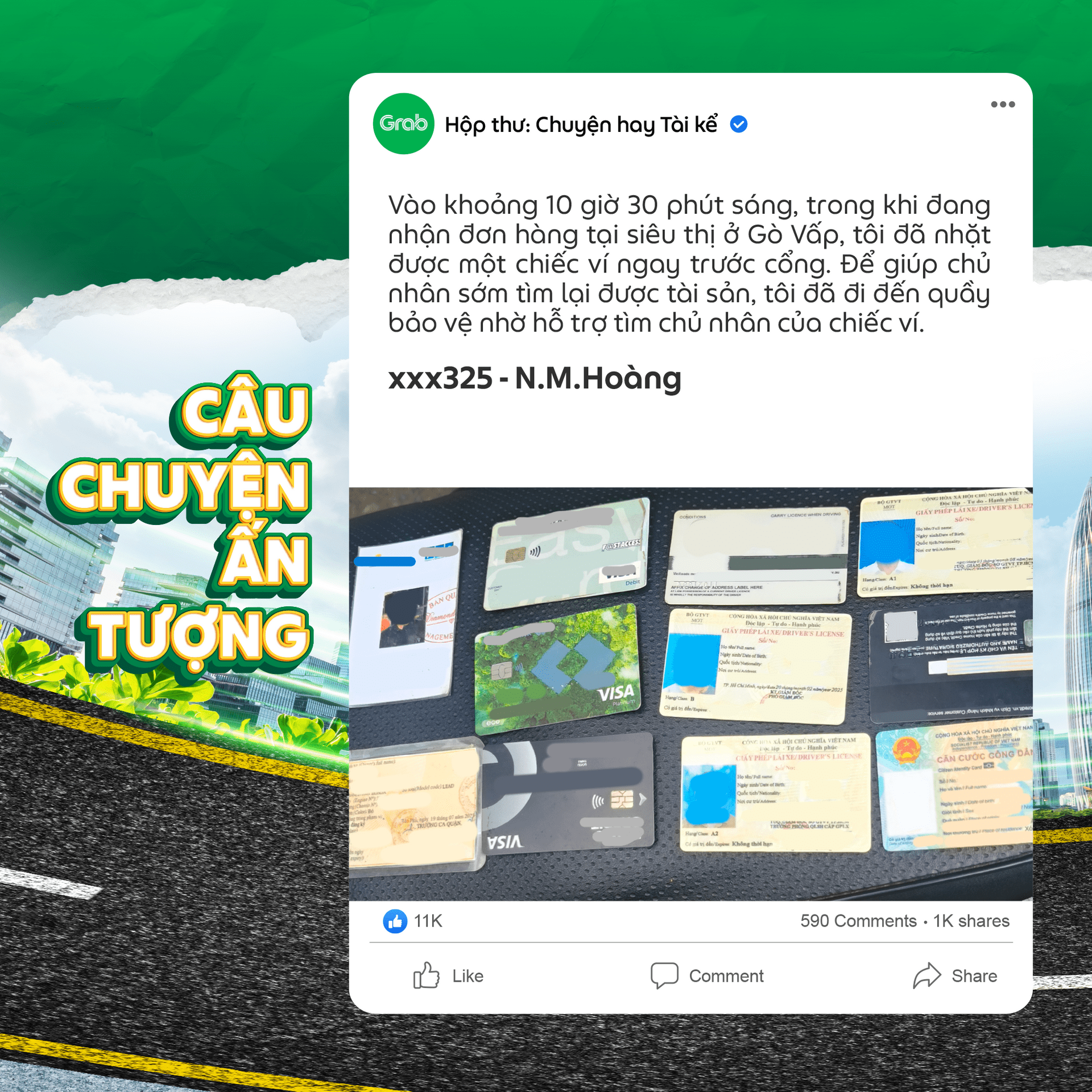 Vào khoảng 10 giờ 30 phút sáng, trong khi đang nhận đơn hàng tại siêu thị ở Gò Vấp, tôi đã nhặt được một chiếc ví ngay trước cổng. Để giúp chủ nhân sớm tìm lại được tài sản, tôi đã đi đến quầy bảo vệ nhờ hỗ trợ tìm chủ nhân của chiếc ví. Vì lo ngại chủ nhân sẽ gặp nhiều khó khăn trong việc làm lại giấy tờ tùy thân, tôi đã cố gắng dùng nhiều cách để liên lạc và để họ có thể đến nhận lại. Hy vọng sẽ sớm gửi lại chiếc ví và số giấy tờ này lại cho bạn ấy.