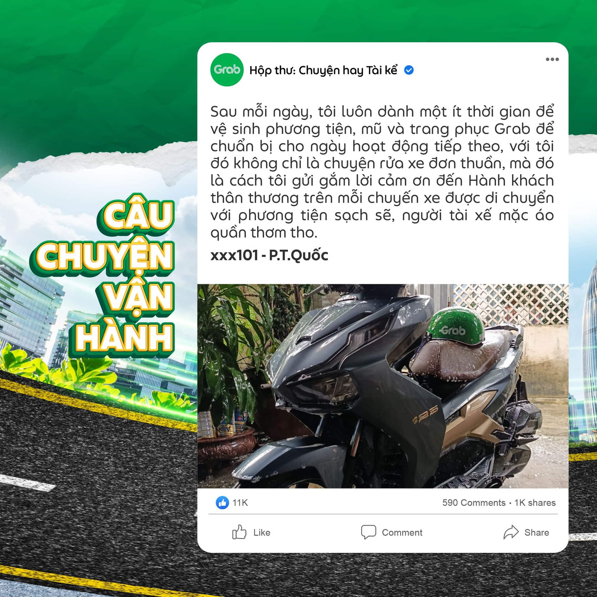 Sau mỗi ngày, tôi luôn dành một ít thời gian để vệ sinh phương tiện, mũ và trang phục Grab để chuẩn bị cho ngày hoạt động tiếp theo, với tôi đó không chỉ là chuyện rửa xe đơn thuần, mà đó là cách tôi gửi gắm lời cảm ơn đến Hành khách thân thương trên mỗi chuyến xe được di chuyển với phương tiện sạch sẽ, người tài xế mặc áo quần thơm tho.