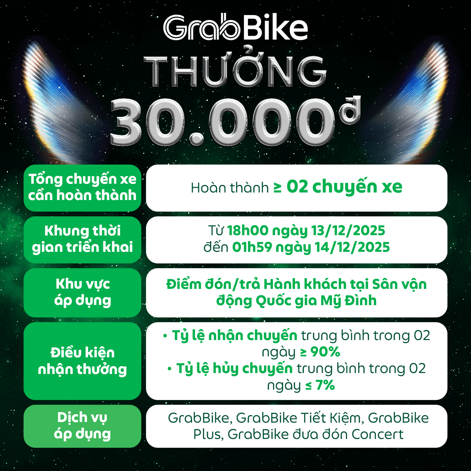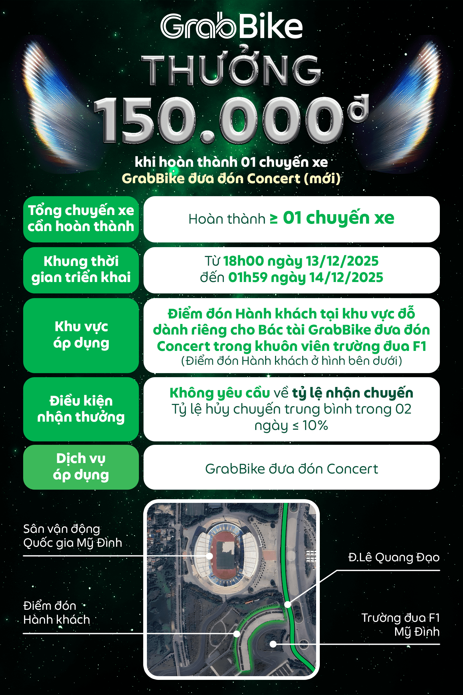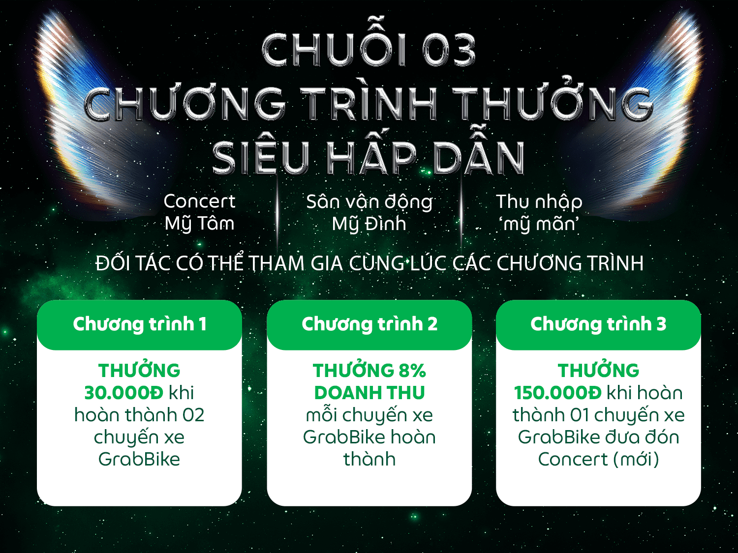 💰 Chương trình 03: THƯỞNG 150.000Đ khi hoàn thành 01 chuyến xe GrabBike đưa đón Concert (mới) – chỉ dành cho các Đối tác đăng ký thành công