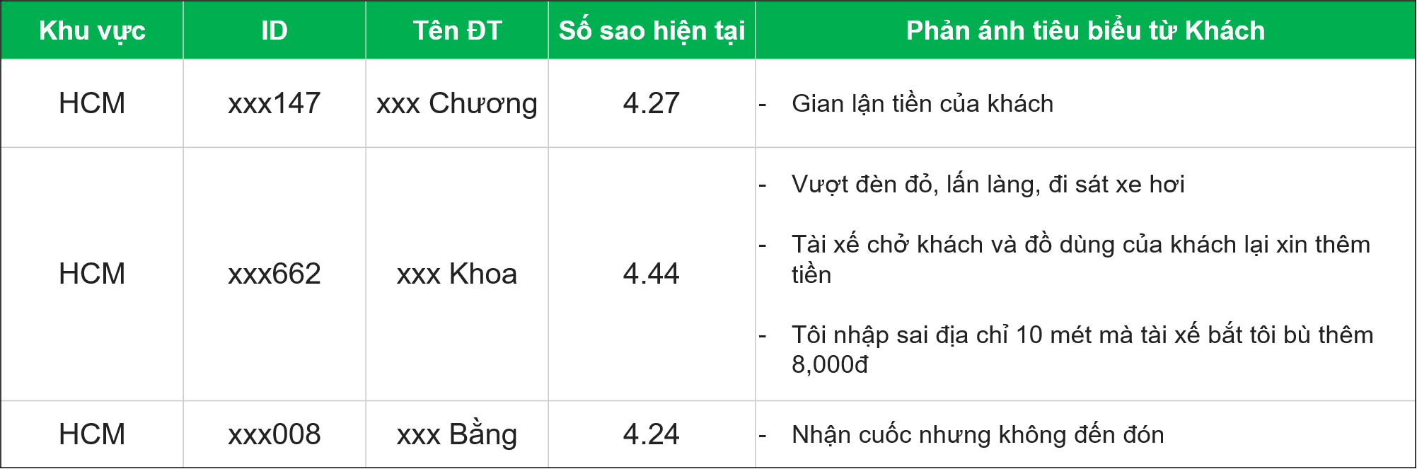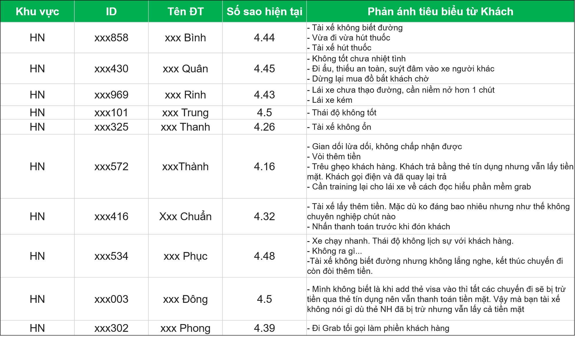 Đối với những Đối Tác có số sao đánh giá DƯỚI 4.7, và nhận được NHIỀU phản ánh từ Khách Hàng (cập nhật đến 10/7/2017), Grab rất tiếc phải ngưng hoạt động tài khoản của Quý Đối Tác theo danh sách bên dưới: