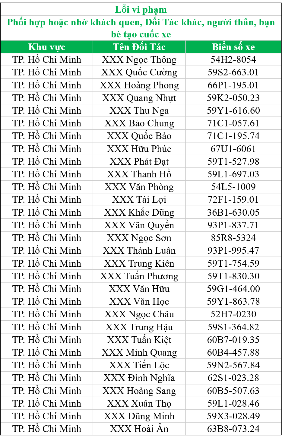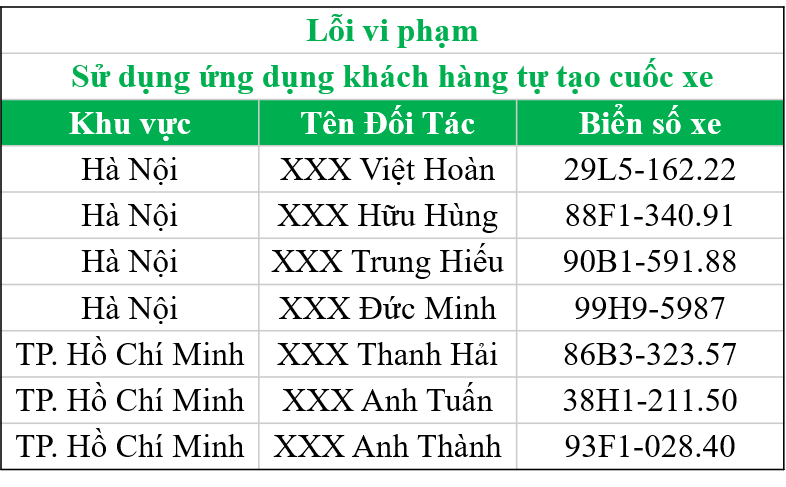 Trong tháng 9 & 10, hệ thống kiểm soát hành vi toàn cầu của Grab đã phát hiện các Đối Tác vi phạm những quy định trên và tiến hành khóa vĩnh viễn theo danh sách bên dưới: