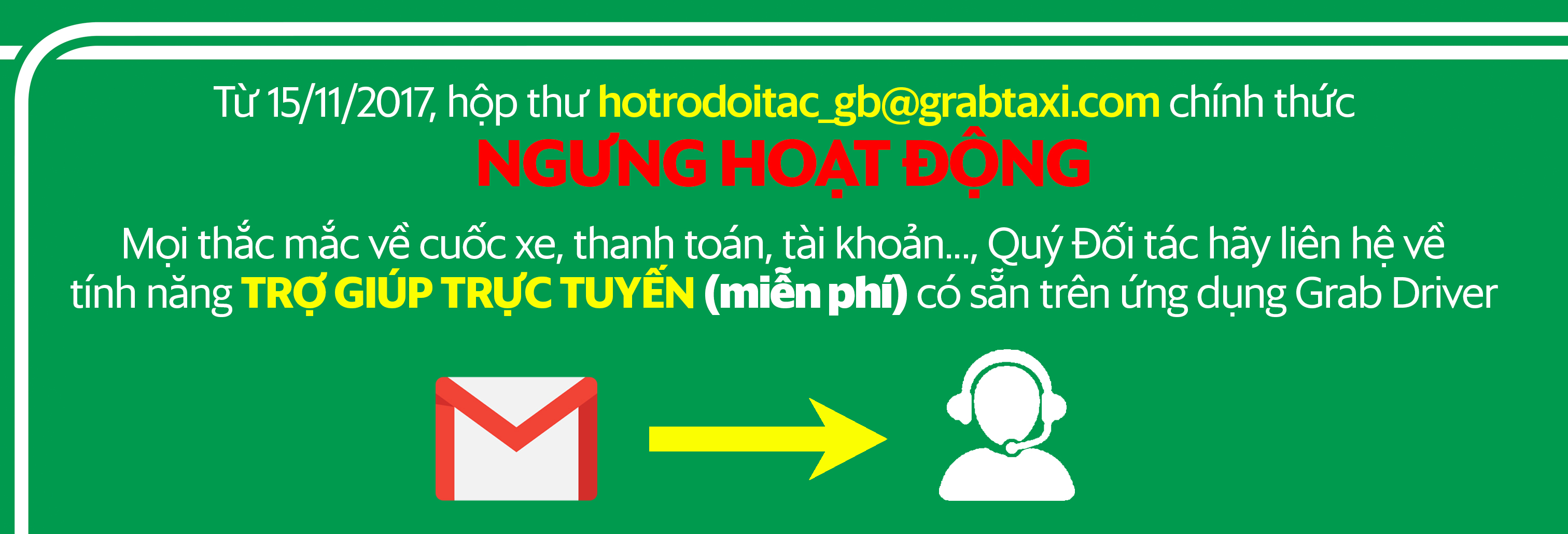 Từ ngày 15/11/2017 Grab sẽ chính thức ngừng hộp thư hỗ trợ: hotrodoitac_gb@grabtaxi.com và chỉ tiếp nhận cũng như trợ giúp Đối Tác qua tính năng TRỢ GIÚP TRỰC TUYẾN, có sẵn trên ứng dụng Grab Driver.