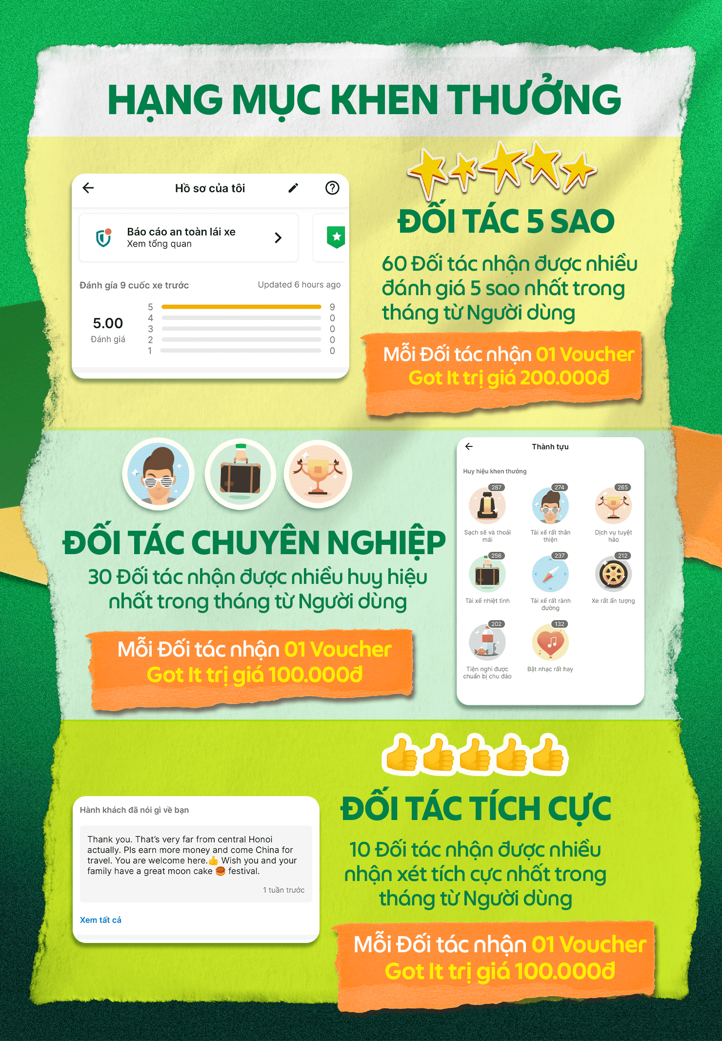 Các giải thưởng sẽ được trao như sau tại mục Tin nhắn trong ứng dụng Grab Driver trong vòng 30 ngày để từ ngày công bố giải thưởng. Đối tác vui lòng sử dụng Voucher Got It trong 30 ngày kể từ ngày nhận thưởng. Sau thời gian này, Grab không chịu trách nhiệm trao lại, hoàn lại giải thưởng.