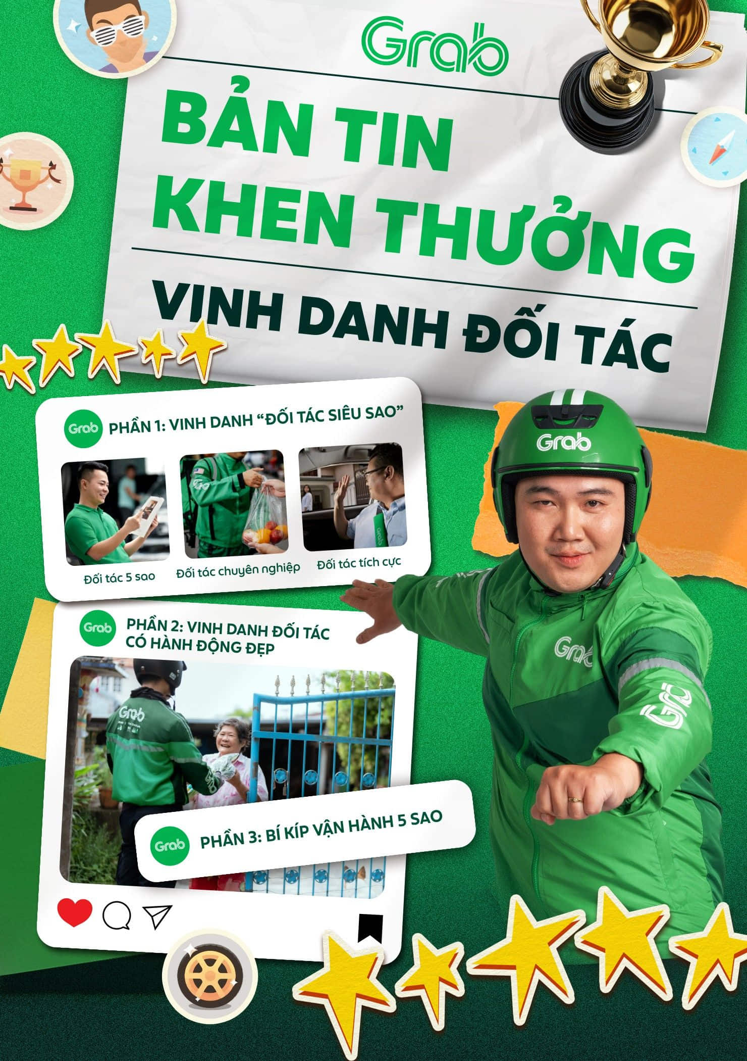 Mỗi tháng, các Đối tác không chỉ có cơ hội ghi danh lên Bản tin khen thưởng 🎁 nhận phần quà tri ân từ Grab, mà còn được chia sẻ những 💡 mẹo hoạt động hữu ích để việc hoạt động cùng Grab ngày càng hiệu quả và an toàn hơn!