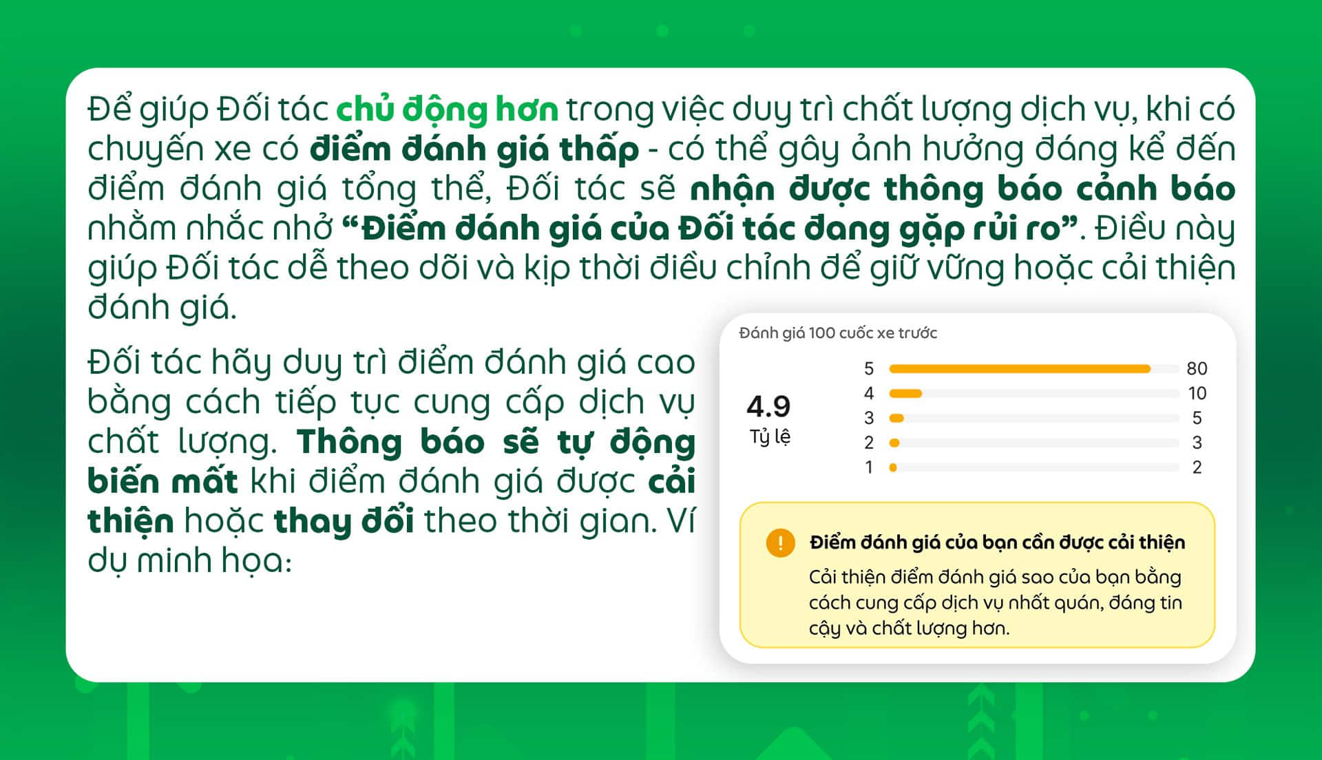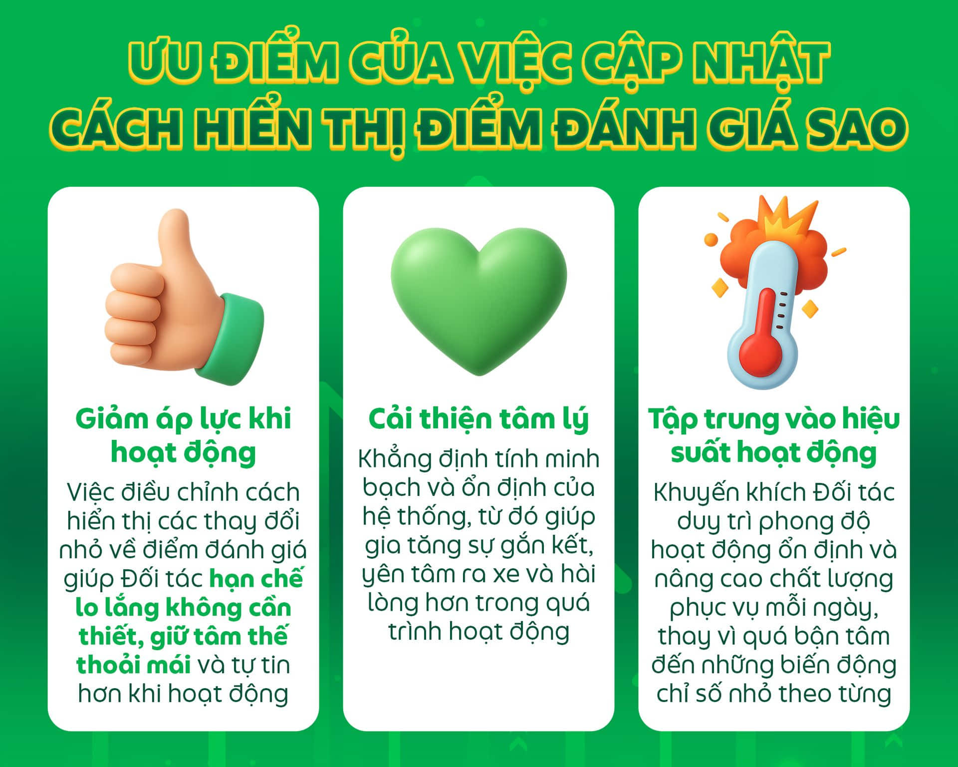 - Các thông tin khác về Điểm đánh giá sao, bao gồm Hệ thống xếp hạng và phương thức tính toán, vẫn được giữ nguyên như hiện tại. Cập nhật này chỉ điều chỉnh hiển thị điểm đánh giá sao trên ứng dụng, không làm thay đổi xếp hạng thực tế của Đối tác.
