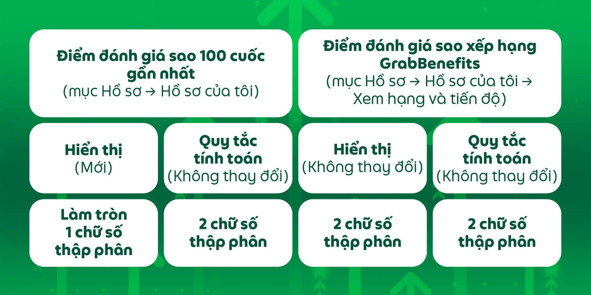 - Điểm đánh giá sao hiển thị tại Tiến độ xếp hạng GrabBenefits vẫn sẽ được giữ nguyên cách tính và hiển thị với 02 chữ số thập phân.