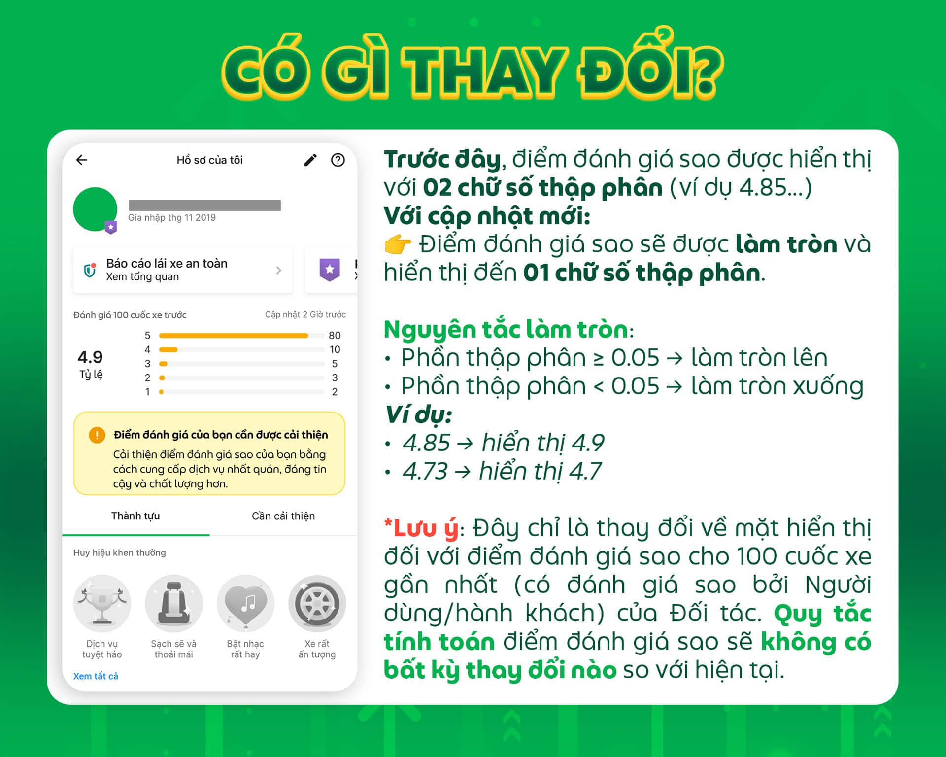 - Điểm đánh giá sao hiển thị tại Tiến độ xếp hạng GrabBenefits vẫn sẽ được giữ nguyên cách tính và hiển thị với 02 chữ số thập phân.