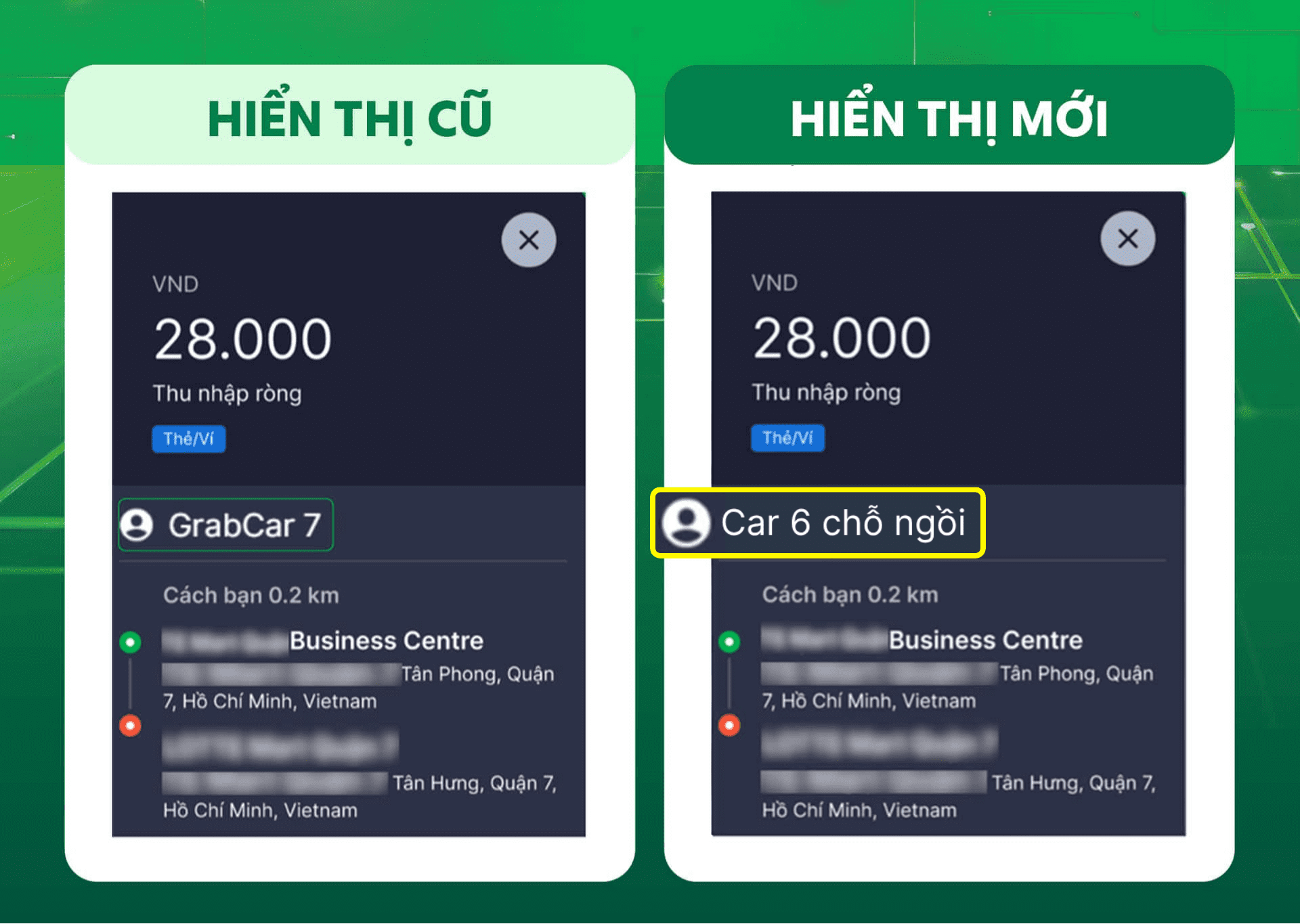 • Dịch vụ áp dụng: GrabCar 7, GrabTaxi 7, GrabCar 7 tuyến, Thuê GrabCar 7 theo giờ.