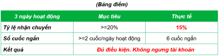 Sau buổi gặp gỡ và trên tinh thần luôn lắng nghe ý kiến đóng góp của Quý đối tác, chúng tôi sẽ dừng việc tạm ngưng tài khoản 01 tuần, với các Đối tác có tỷ nhận chuyến <= 20%.