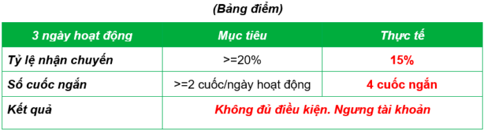 - Nếu Quý Đối Tác hoàn thành đủ 2 cuốc ngắn/ngày hoạt động và tỷ lệ nhận chuyến dưới (hoặc bằng) 20%, chúng tôi sẽ KHÔNG ngưng tài khoản của Quý đối tác 1 tuần.