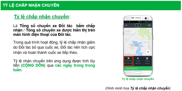 - Nếu Quý Đối Tác không hoàn thành ít nhất 2 cuốc ngắn/ngày hoạt động và tỷ lệ nhận chuyến dưới (hoặc bằng) 20%, chúng tôi sẽ tạm ngưng tài khoản của Quý đối tác 1 tuần.