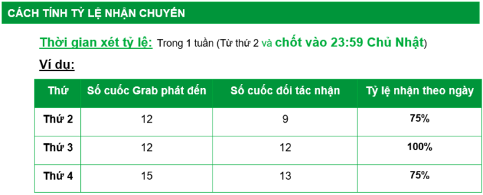Ví dụ: Đối tác hoạt động vào thứ 2, thứ 4, thứ 6. Số cuốc xe phát đến máy 100 cuốc. Đối tác bấm chấp nhận 15 cuốc. Trong đó Đối tác hoàn thành tổng 6 cuốc xe ngắn/3 ngày hoạt động.