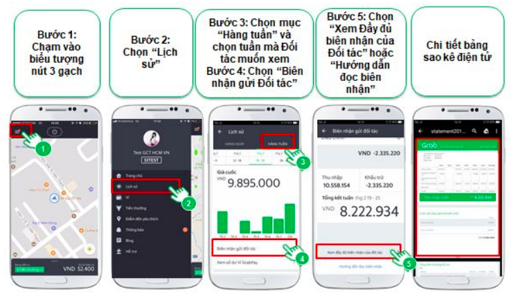 - Đồng thời, vào mỗi thứ Ba, hệ thống sẽ tự động gửi bảng sao kê thu nhập hàng tuần qua địa chỉ email mà Đối tác đã đăng ký với Grab.