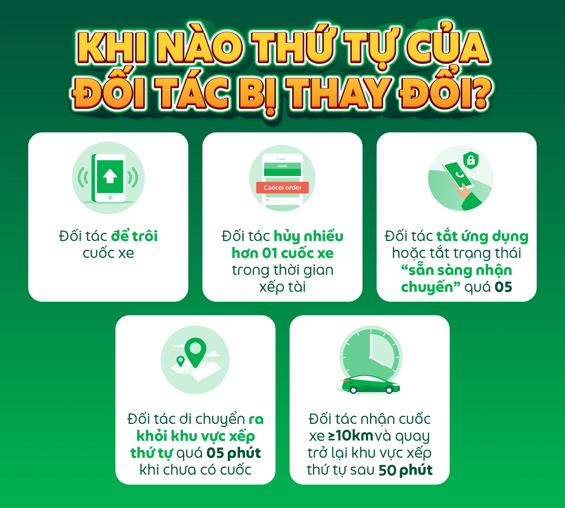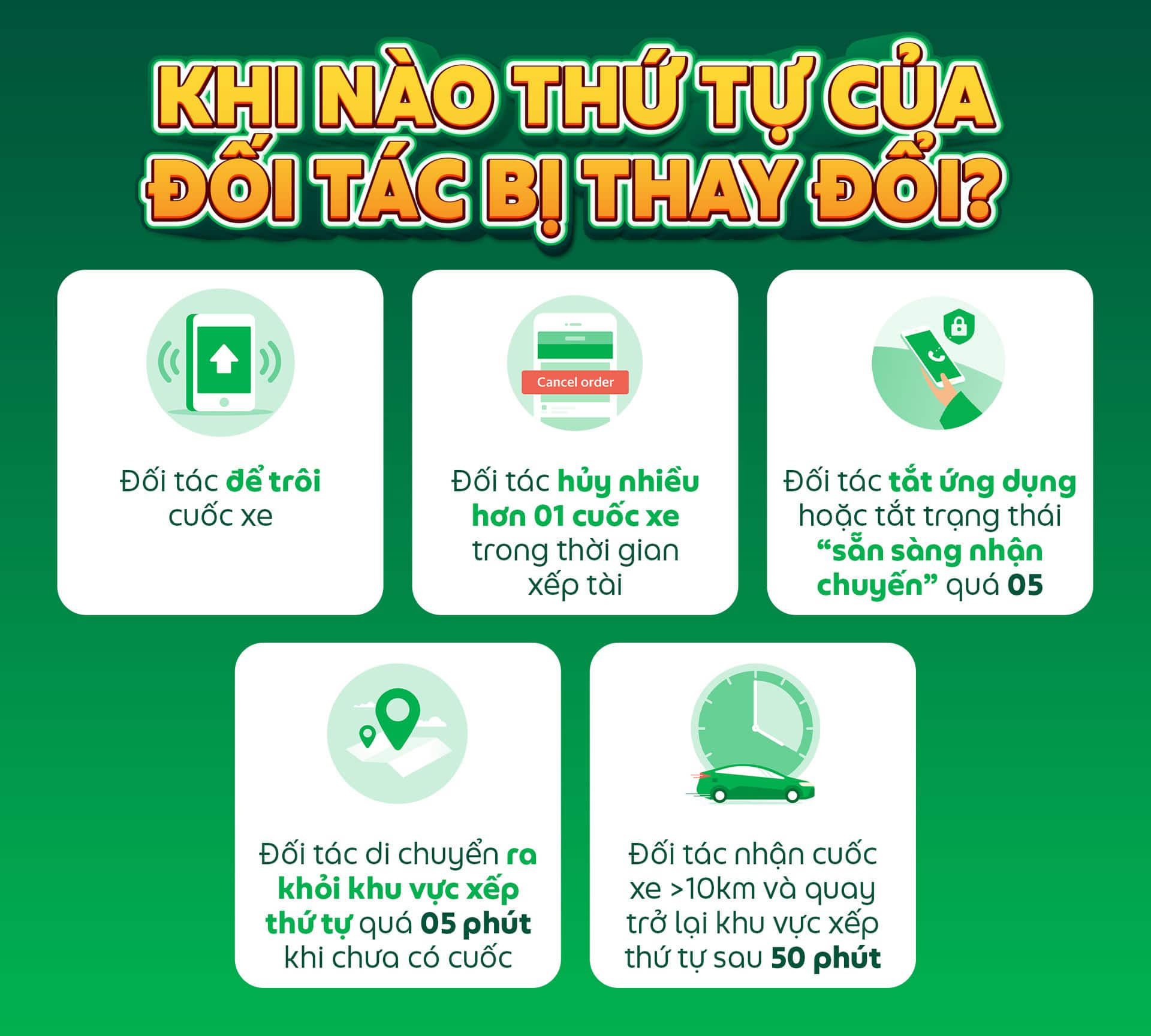 Trường hợp Hành khách hủy chuyến xe khi Đối tác đã di chuyển ra khỏi khu vực xếp thứ tự, Đối tác cần phải quay trở lại khu vực xếp thứ tự trong vòng 05 phút để giữ được số thứ tự ban đầu của mình.