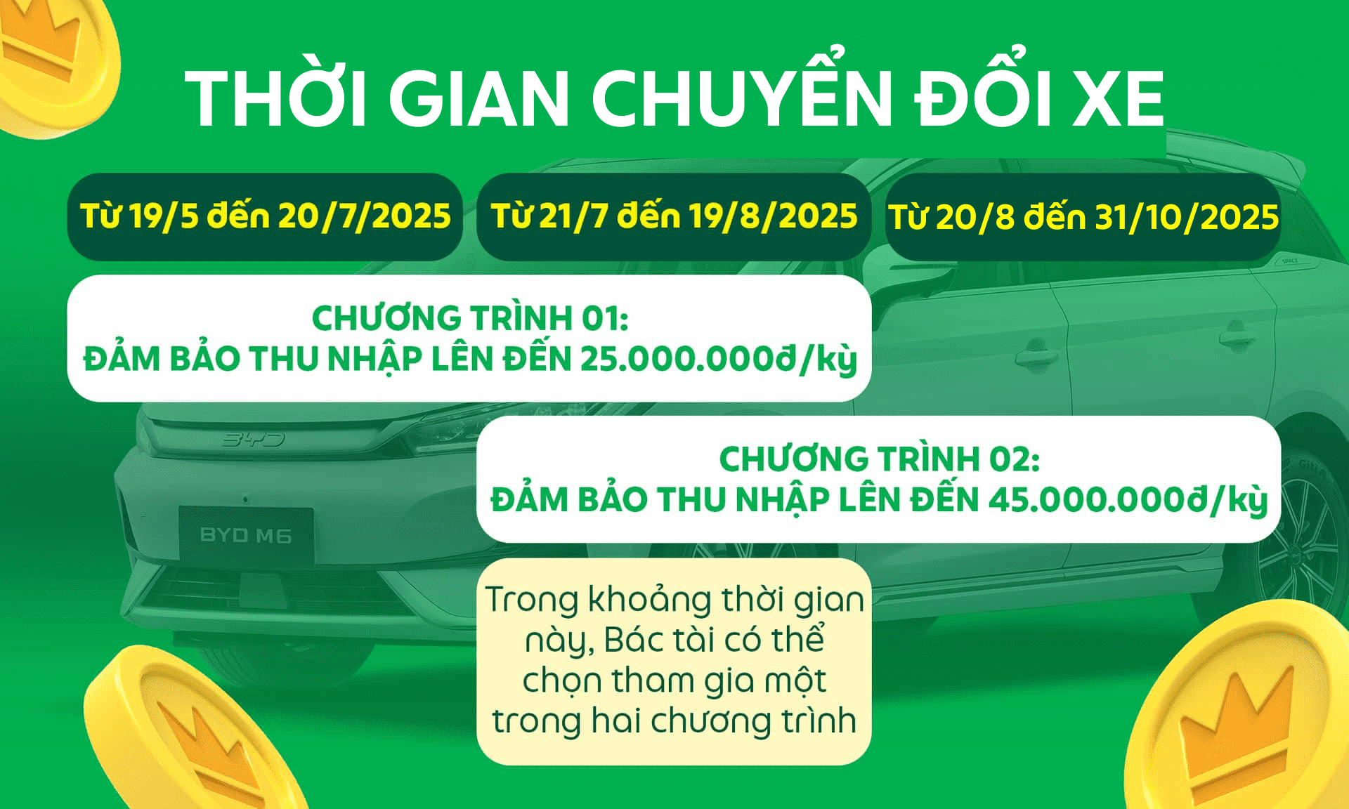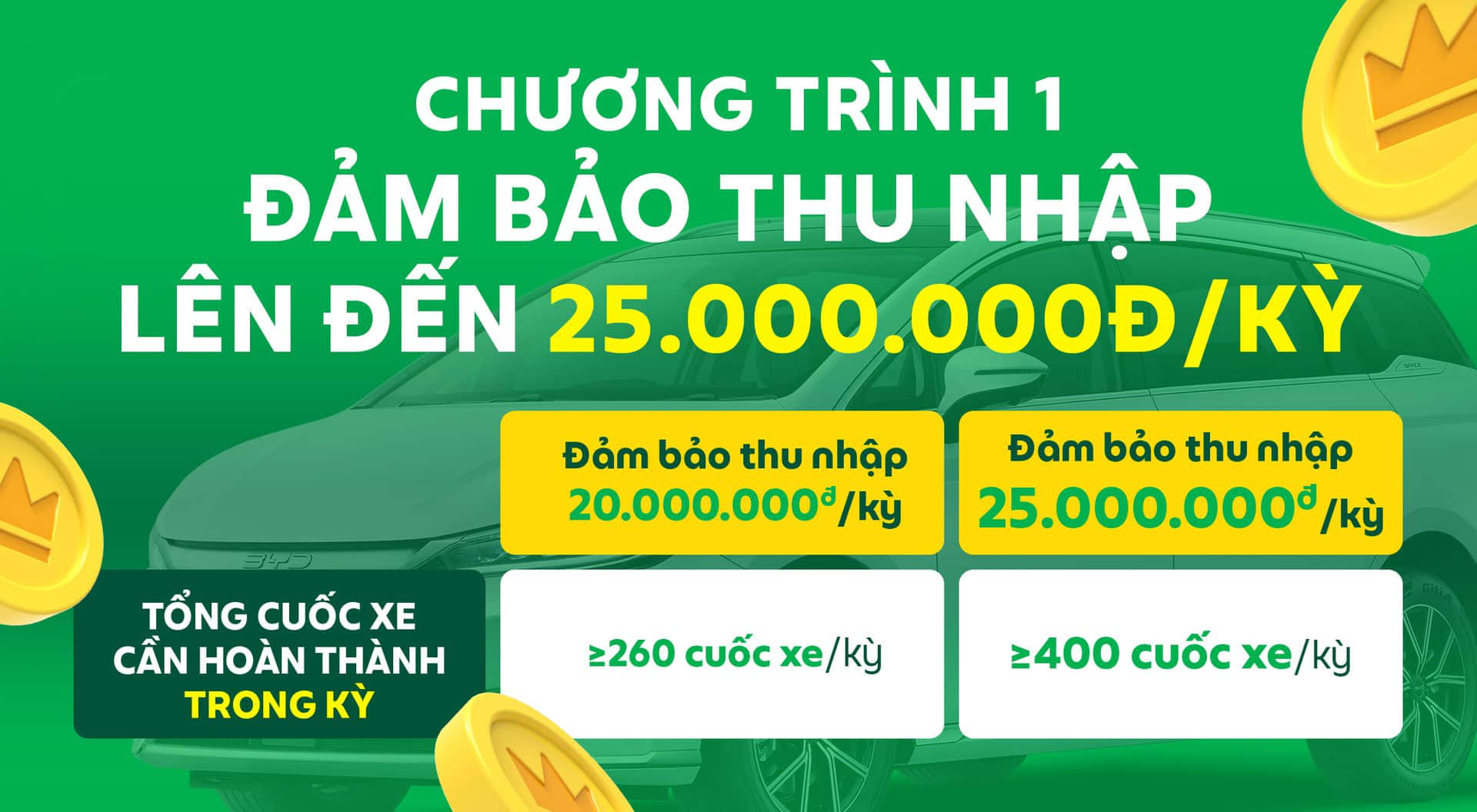Tôi có thể tham gia chương trình 02 lần không? | Mỗi Bác tài chỉ được tham gia chương trình “Chất từng cuốc – Chốt BYD” 01 lần duy nhất. Chương trình đảm bảo thu nhập sẽ tự động được áp dụng và không đổi sau khi Bác tài nhận được xe, và hoàn tất thủ tục chuyển đổi xe thành công trên ứng dụng Grab Driver. |