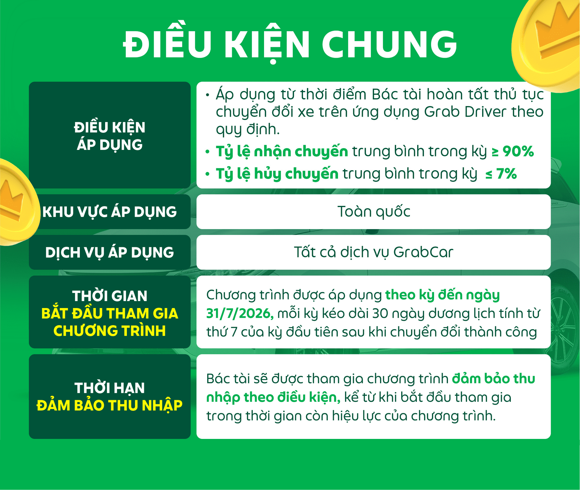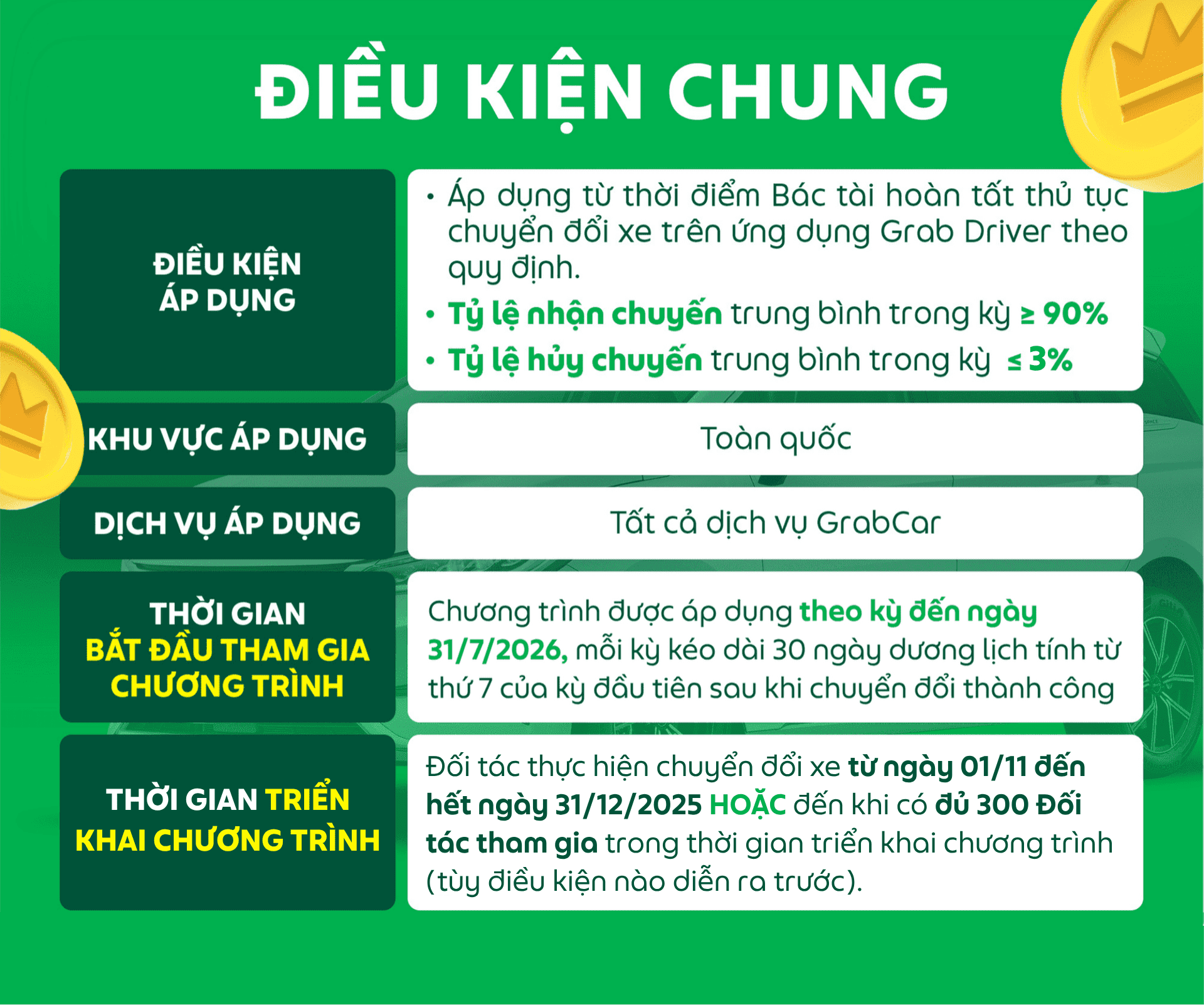 - Chương trình chỉ áp dụng cho Bác tài Grab đã hoàn tất đăng ký vào biểu mẫu tham gia chương trình và được chấp thuận hợp lệ bởi Grab.