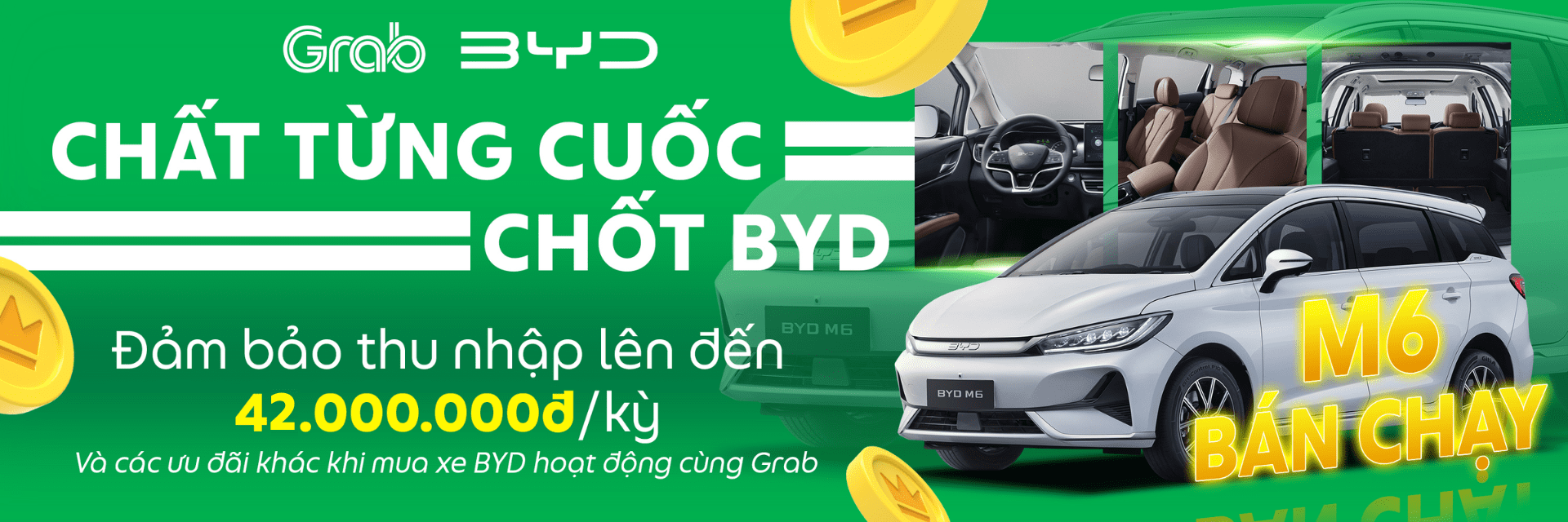 Thông qua chương trình “Chất từng cuốc – Chốt BYD”, giờ đây Bác tài có thể sắm cho mình một chiếc “xế cưng” BYD để hoạt động cùng Grab với các ưu đãi hấp dẫn, đồng thời được tham gia chương trình đảm bảo thu nhập lên đến 42.000.000đ/kỳ. Thông tin chi tiết như sau: