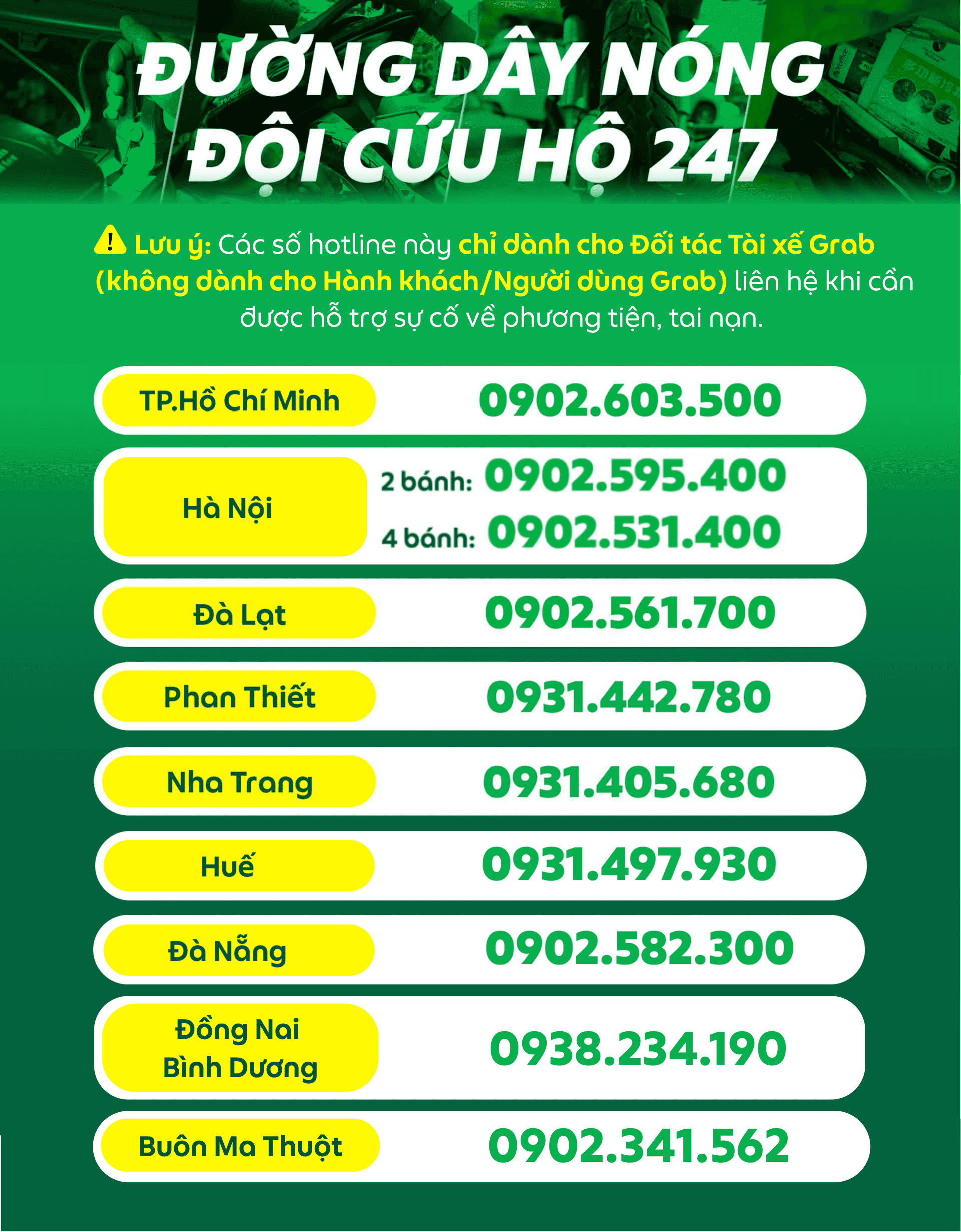 Nhằm giúp Đối tác luôn an tâm trong suốt quá trình hoạt động ngay cả khi gặp phải các sự cố ngoài ý muốn, Grab triển khai Đội cứu hộ 247 tại một số tỉnh/thành phố với thông tin cụ thể như sau: