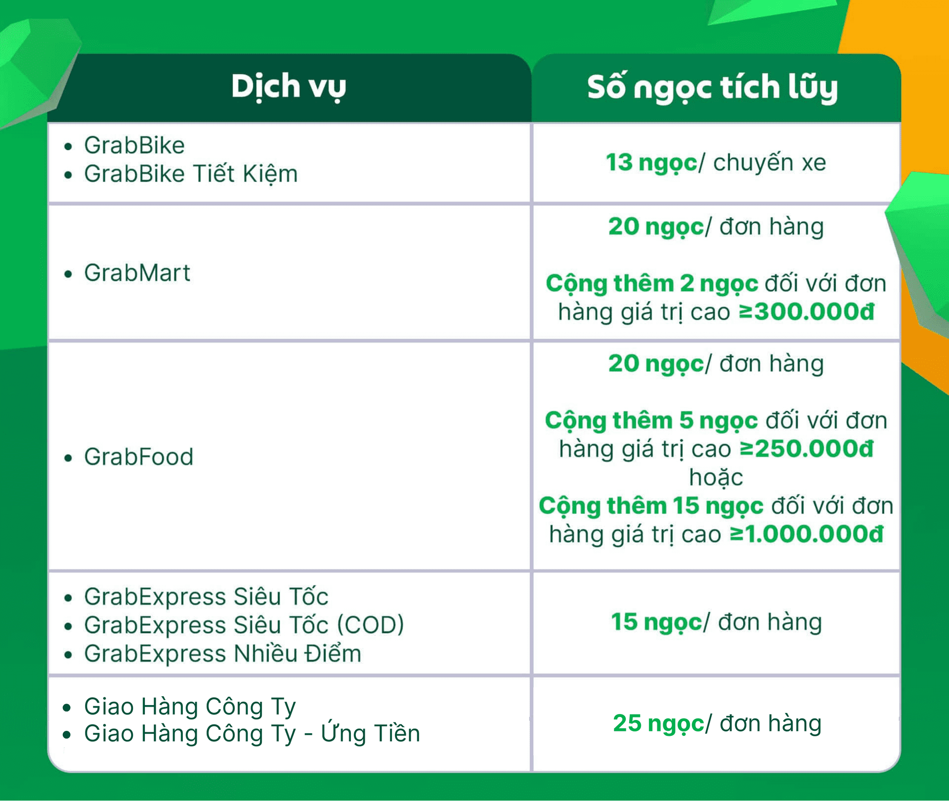 Mỗi chuyến xe hoàn thành sẽ được quy đổi thành số ngọc thưởng tương ứng trên ứng dụng Grab Driver dựa vào bảng bên dưới: