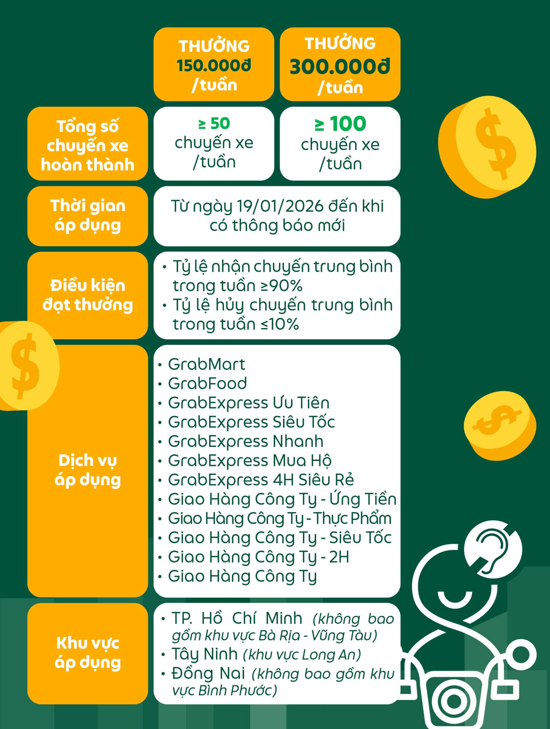 Thấu hiểu và trân trọng hành trình ấy, Grab triển khai chương trình thưởng lên đến 300.000đ/tuần, như một lời đồng hành và tiếp sức, mong rằng mỗi Đối tác có thêm động lực vững bước, an tâm hoạt động.