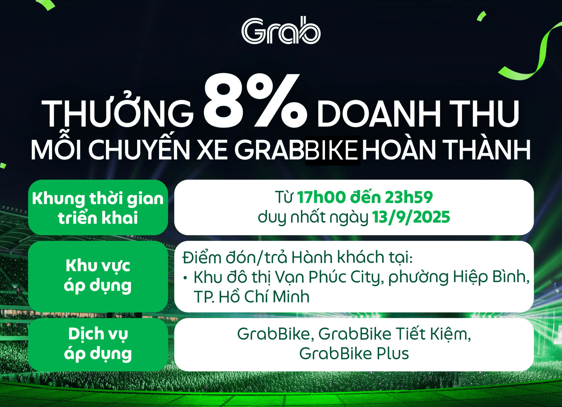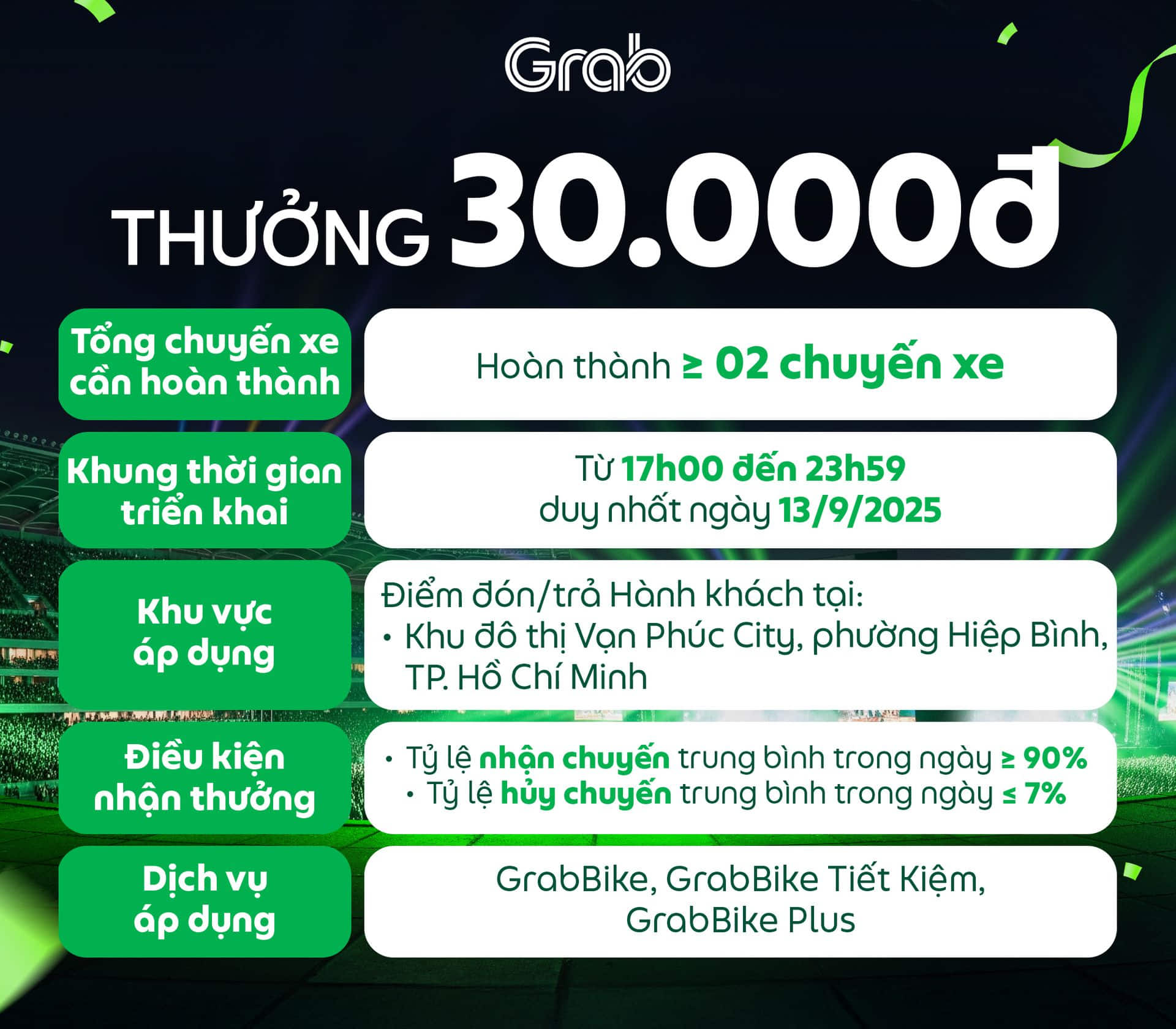 Nhằm giúp Đối tác có thêm cơ hội gia tăng thu nhập và đáp ứng nhu cầu di chuyển của Hành khách, Grab triển khai các chương trình thưởng khi hoàn thành chuyến xe có điểm đón/trả Hành khách tại khu vực áp dụng duy nhất ngày 13/9/2025. Chi tiết như sau: