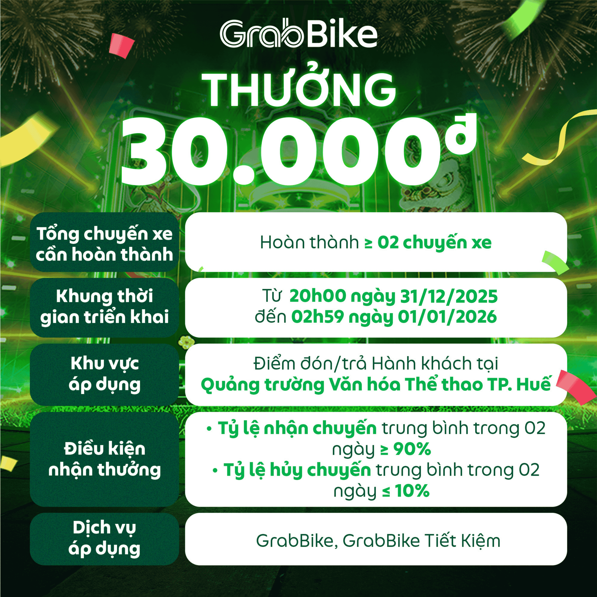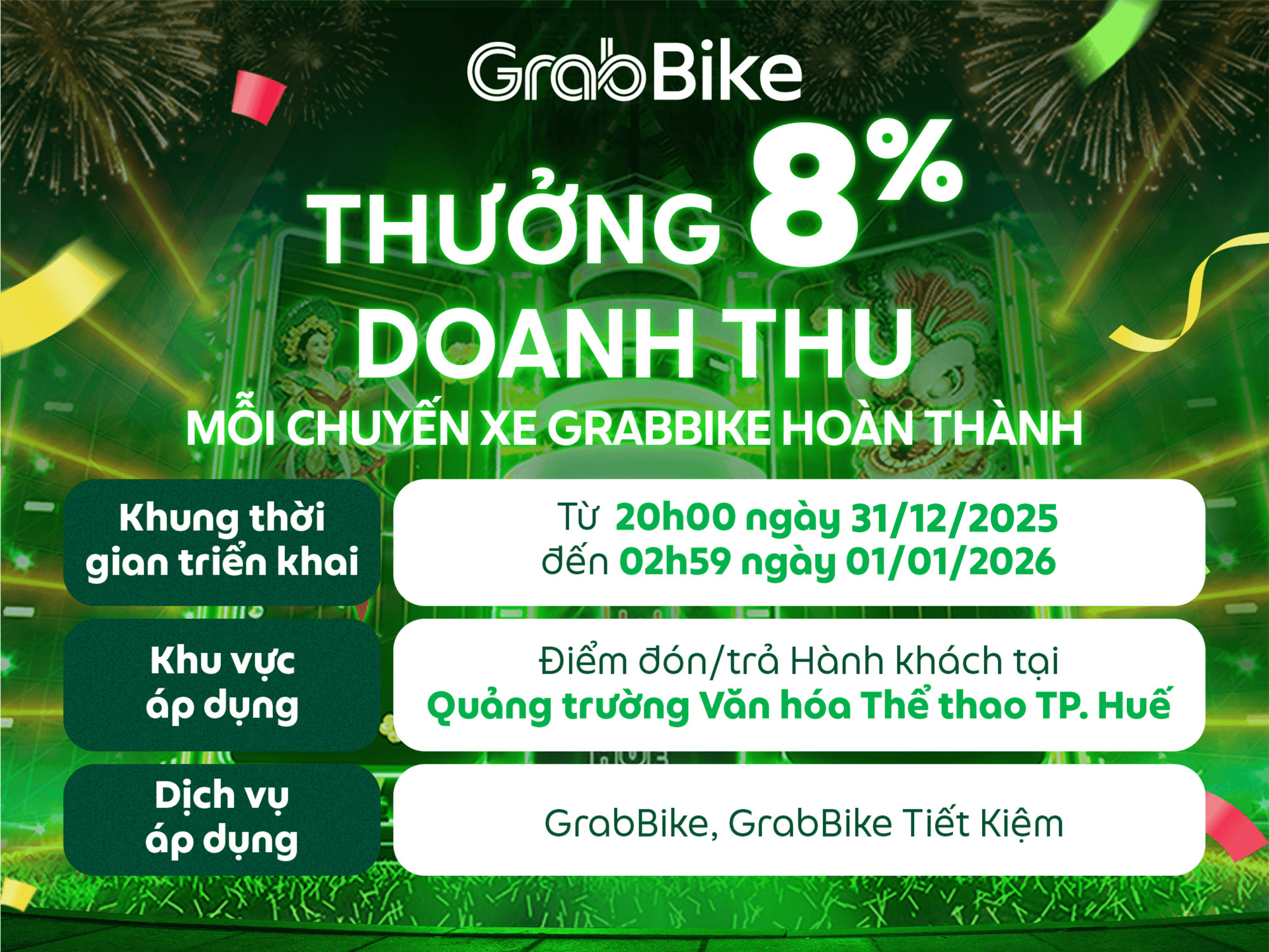 GrabBike | 02 chương trình thưởng đặc biệt ngày 31/12/2025 – 01/01/2026 tại Huế
