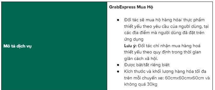 Đối với các Đối tác đã đăng ký tham gia dịch vụ GrabAssistant – nay có tên là GrabExpress Mua Hộ: Grab sẽ tự động kích hoạt lại dịch vụ này cho Đối tác, Đối tác vui lòng kiểm tra việc được kích hoạt tại mục “Loại dịch vụ” hoặc mục “Thông báo” trên ứng dụng Grab Driver.