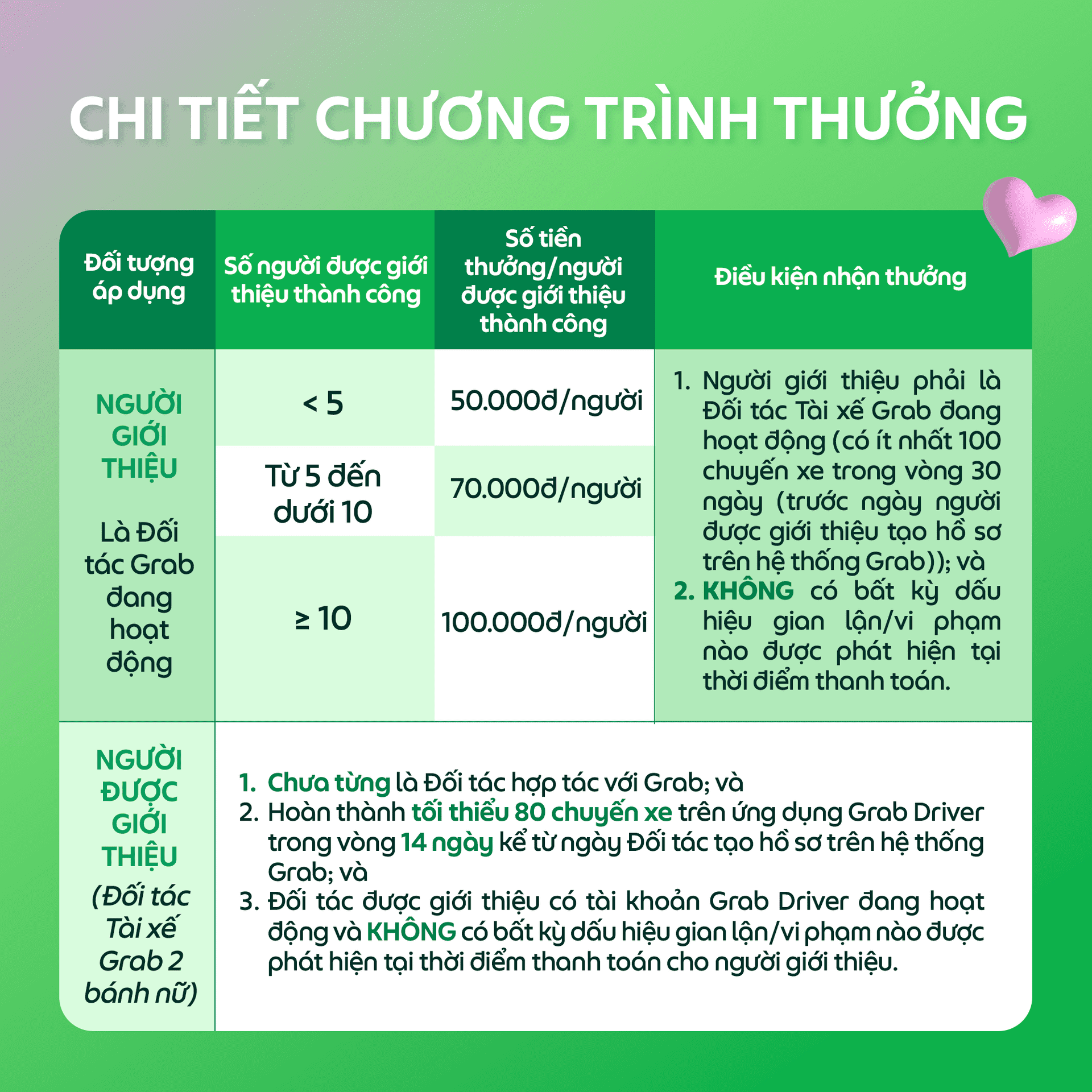 Điều kiện nhận thưởng của chương trình có thể thay đổi tùy theo quyết định của Grab vào từng thời điểm cụ thể và sẽ được thông báo đến Đối tác trước khi áp dụng.