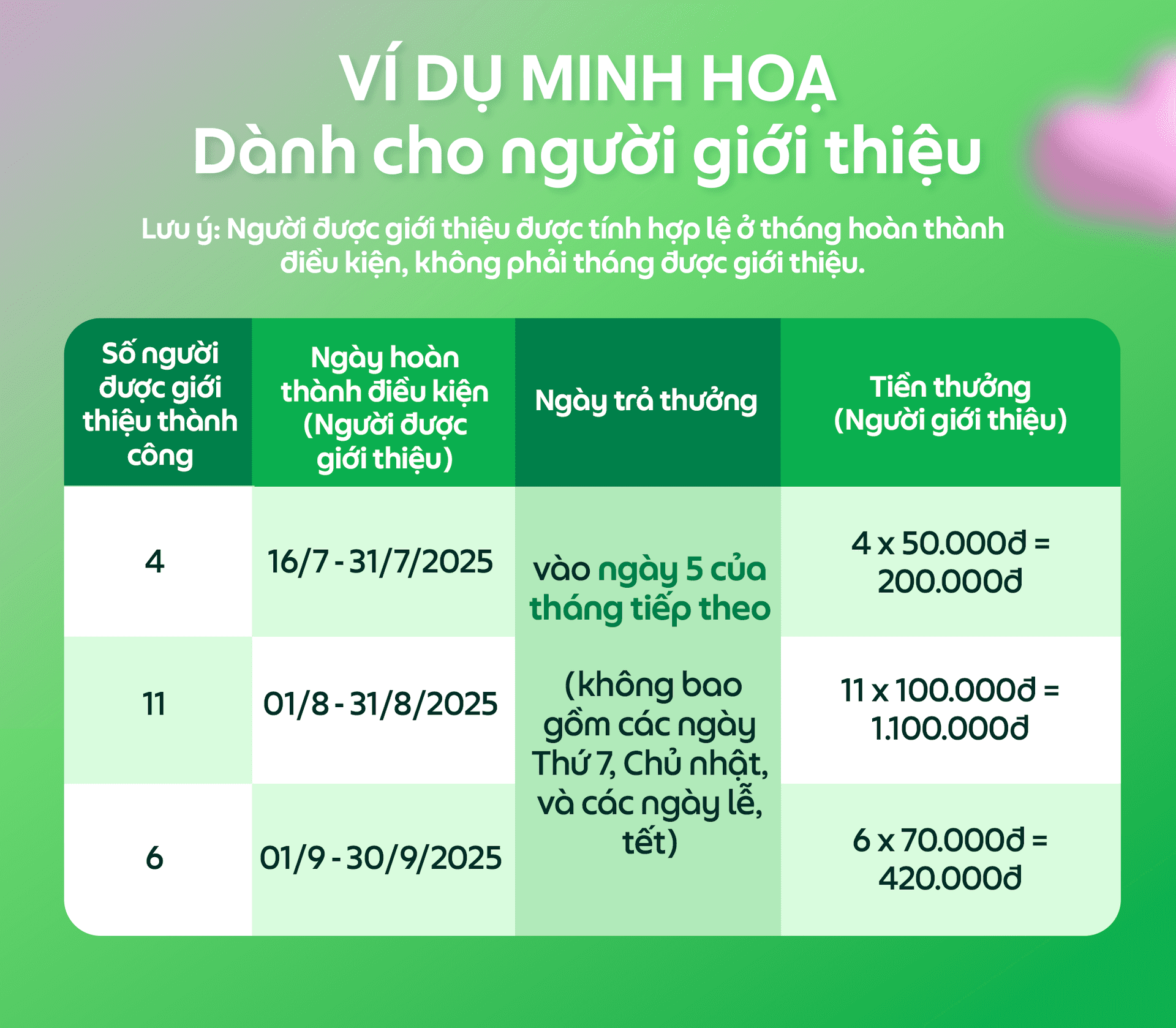 Tiền thưởng sẽ được cộng trực tiếp vào Ví tiền mặt của Đối tác (người giới thiệu) vào ngày 16 của tháng tiếp theo sau khi người được giới thiệu đạt các điều kiện thưởng (không bao gồm các ngày Thứ 7, Chủ nhật, và các ngày lễ, tết).