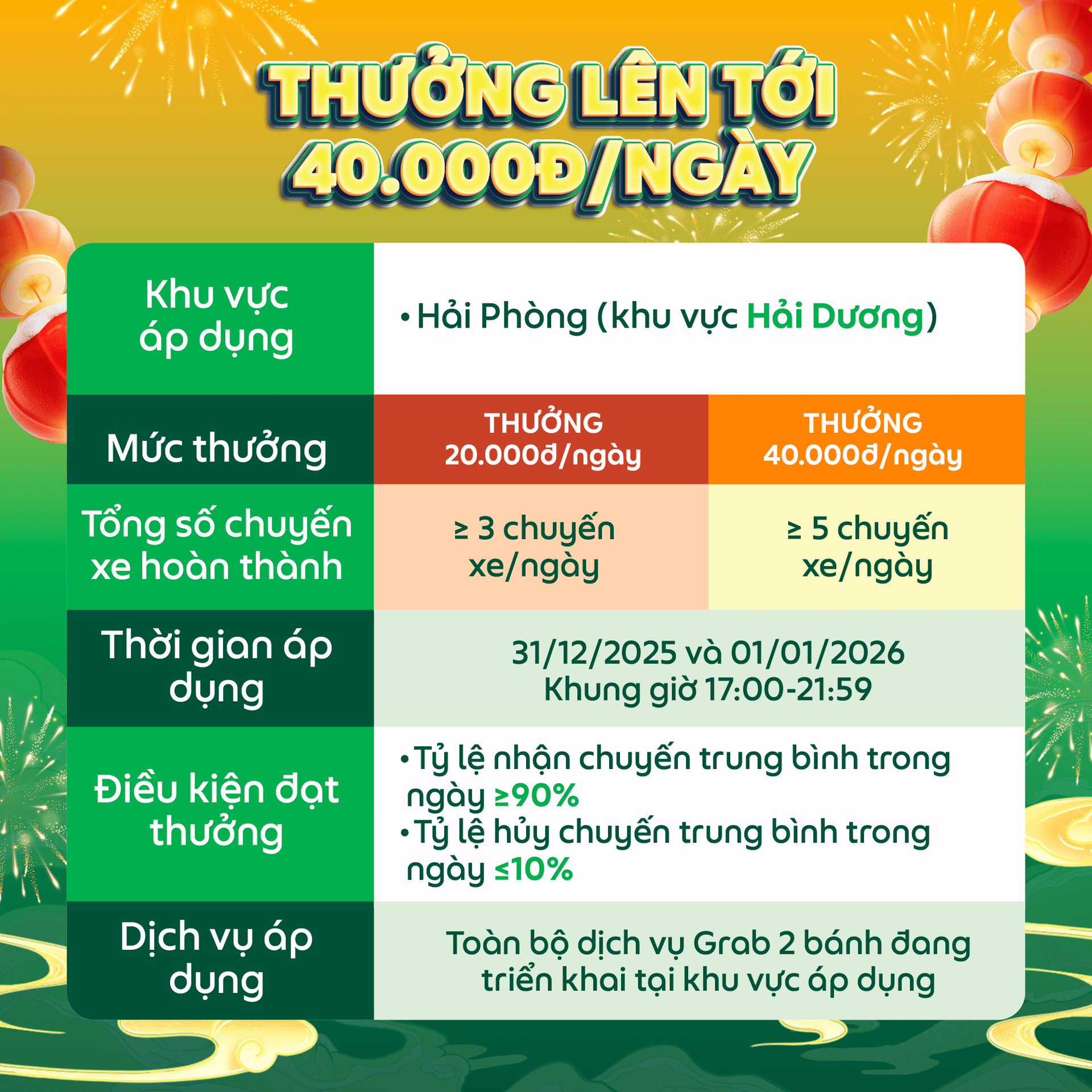 Năm 2025 đang khép lại, mở ra năm mới 2026 với bao dự định và cơ hội mới. Để tiếp thêm ‘nhiên liệu’ cho những hành trình đầu tiên của năm mới, Grab xin gửi đến các Đối tác chương trình thưởng hấp dẫn dịp Tết Dương lịch.