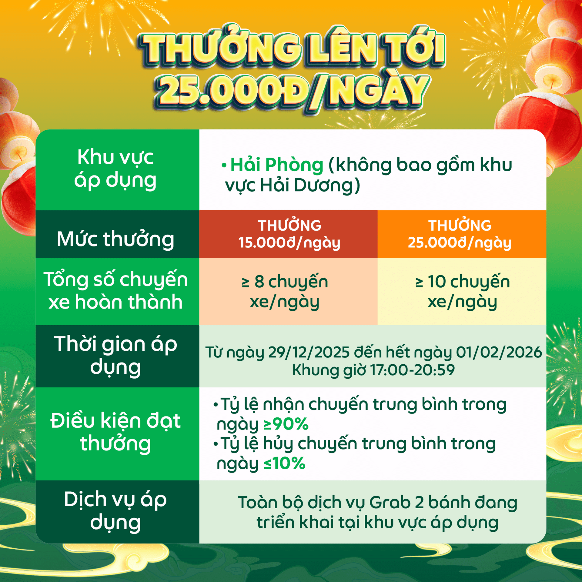 Các điều kiện của chương trình có thể thay đổi và sẽ được thông báo đến Đối tác, Grab có toàn quyền quyết định điều kiện và mức thưởng cuối cùng.