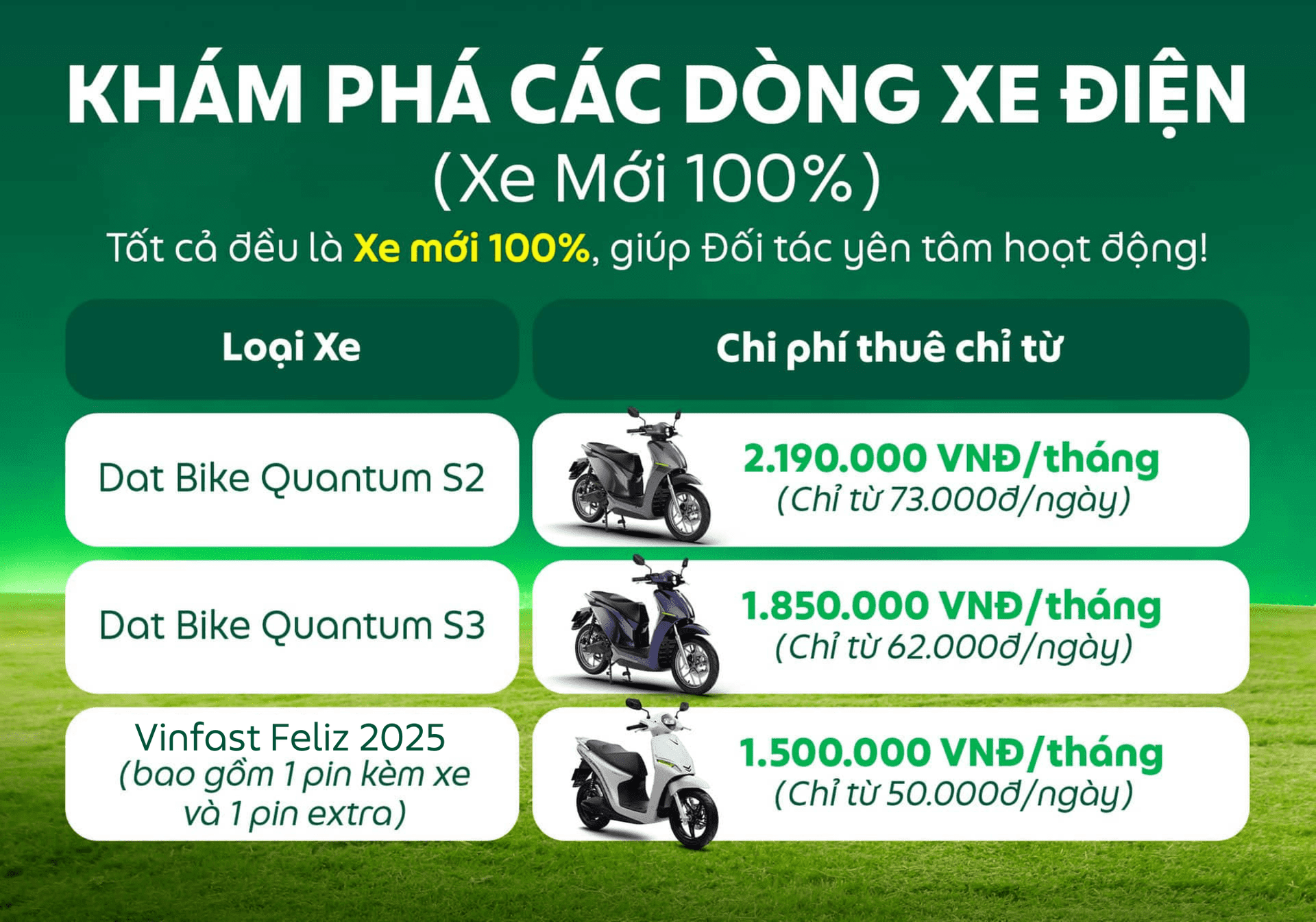 Đây là CƠ HỘI để Đối tác dễ dàng thuê ngay một chiếc xe máy điện với thủ tục thuận tiện và chi phí hợp lý, khám phá cảm giác lái êm ái, và tận hưởng công nghệ hiện đại.