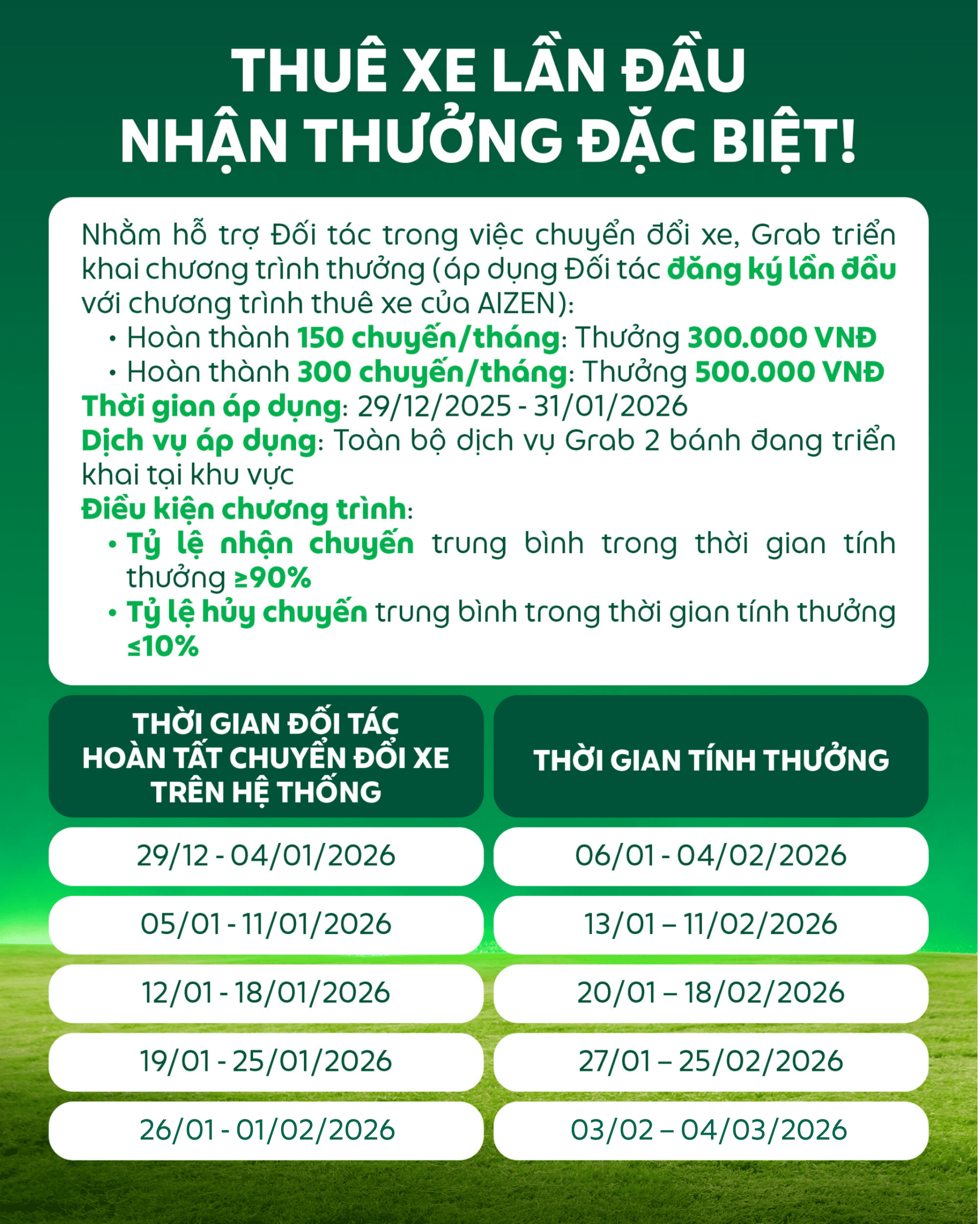 Chương trình áp dụng cho các Đối tác Tài xế Grab đáp ứng đủ điều kiện và nhận thông báo từ Grab. Các tiêu chí tham gia được AIZEN và Grab đánh giá tổng hợp dựa trên nhiều yếu tố và có thể thay đổi theo từng giai đoạn. Vì vậy, Grab và AIZEN sẽ chủ động liên hệ trực tiếp với các Đối tác phù hợp khi chương trình được triển khai. |