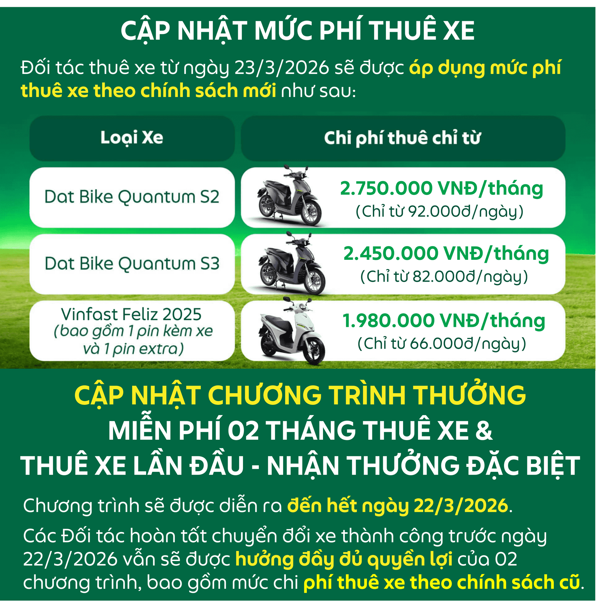 Trải nghiệm xe máy điện MỚI, không lo phí thuê trong 02 tháng đầu tiên khi tham gia thuê xe cùng AIZEN và hoạt động với Grab. Grab triển khai chương trình MIỄN PHÍ 02 tháng thuê xe(*).
