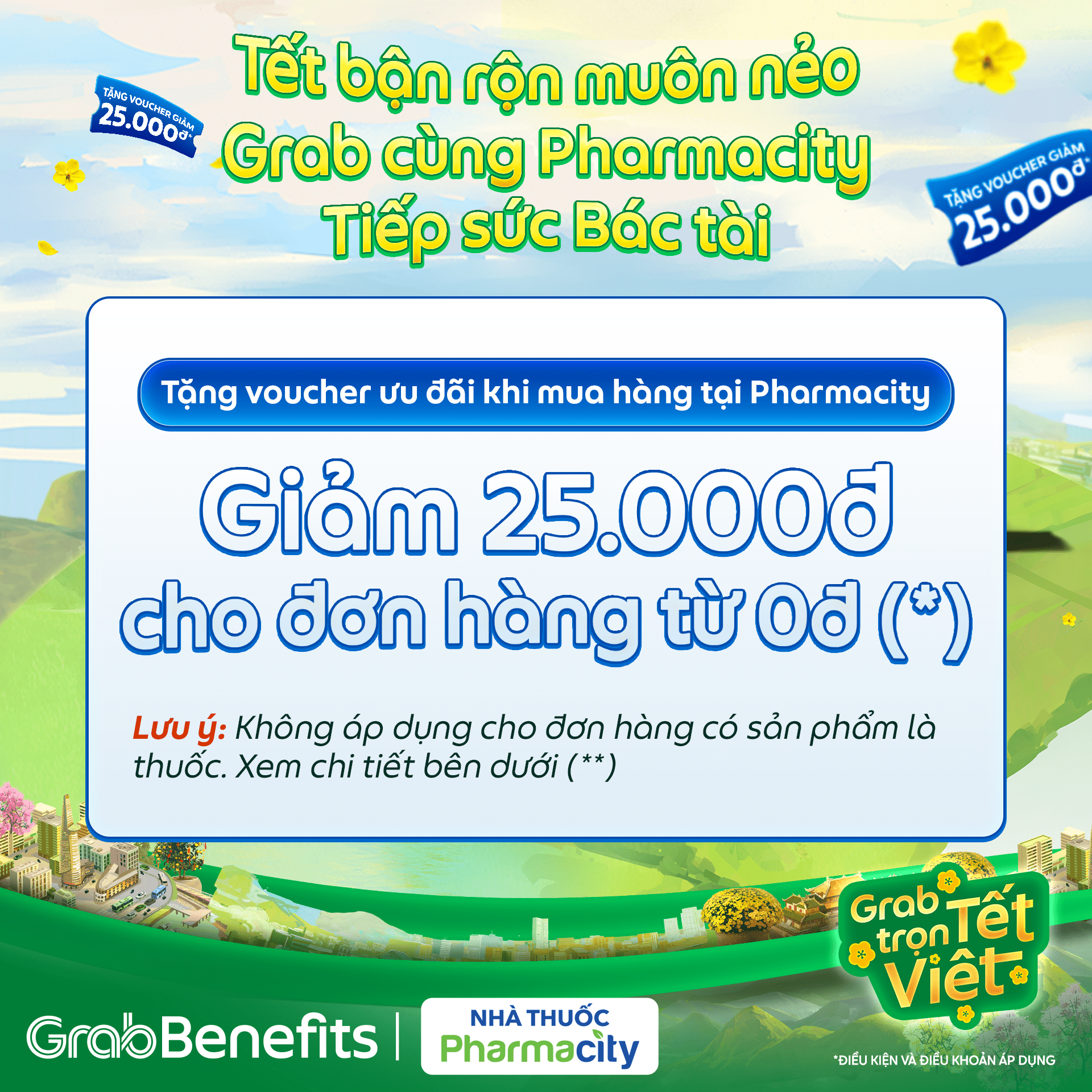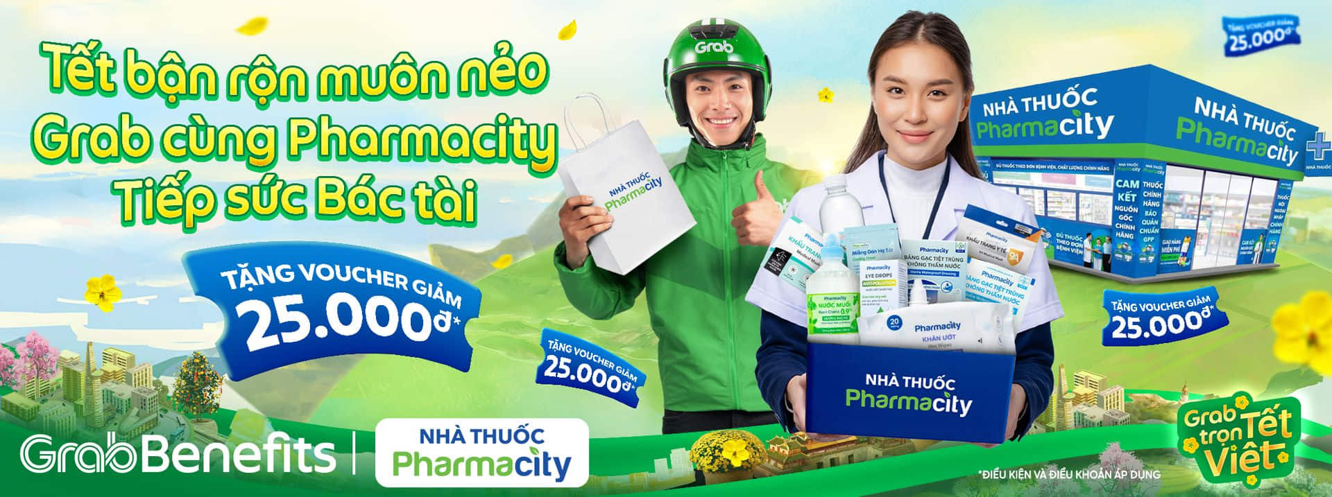 Nhằm tiếp sức các Bác tài hoạt động trong dịp Tết đến xuân về, Grab cùng Pharmacity gửi 🎁 tặng voucher ưu đãi giá trị 25.000đ🎁 đến Bác tài để có thể mua các sản phẩm cần thiết cho sức khỏe và sinh hoạt hằng ngày 👉 Từ đó vững tay lái, yên tâm hoạt động cùng Grab và đón mùa Tết trọn vẹn.
