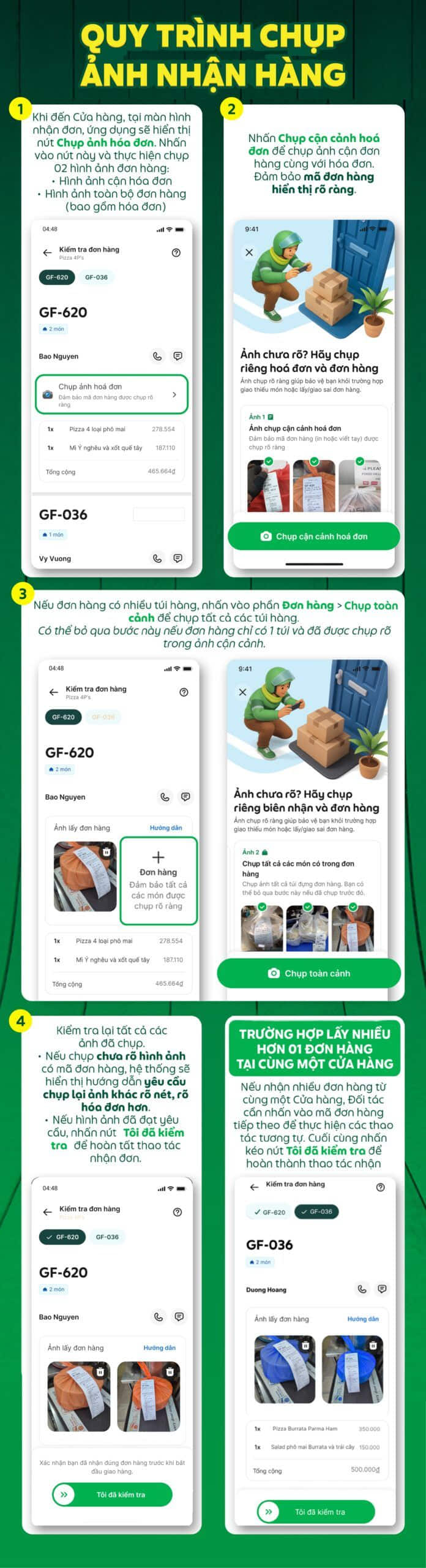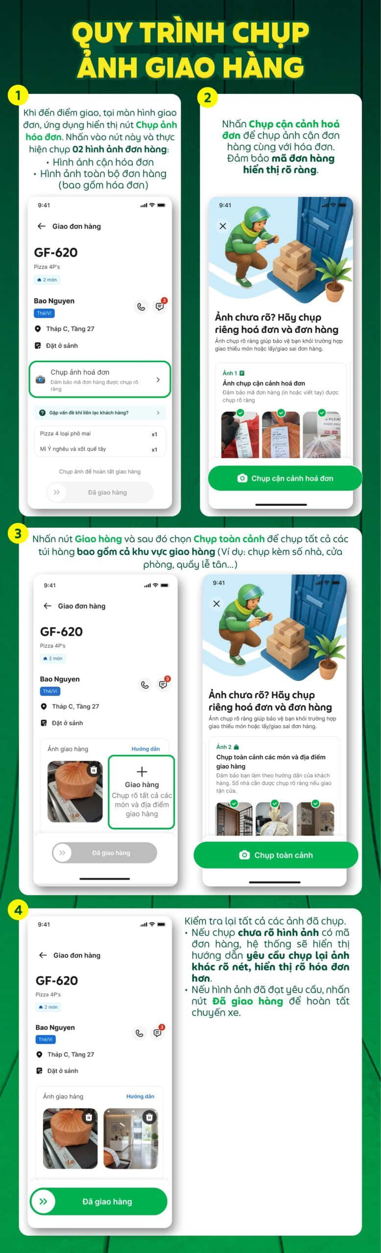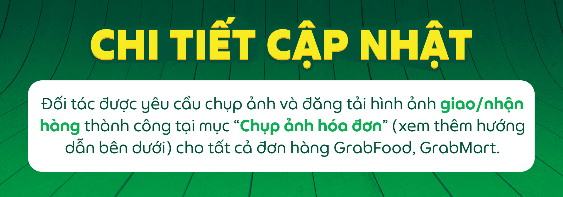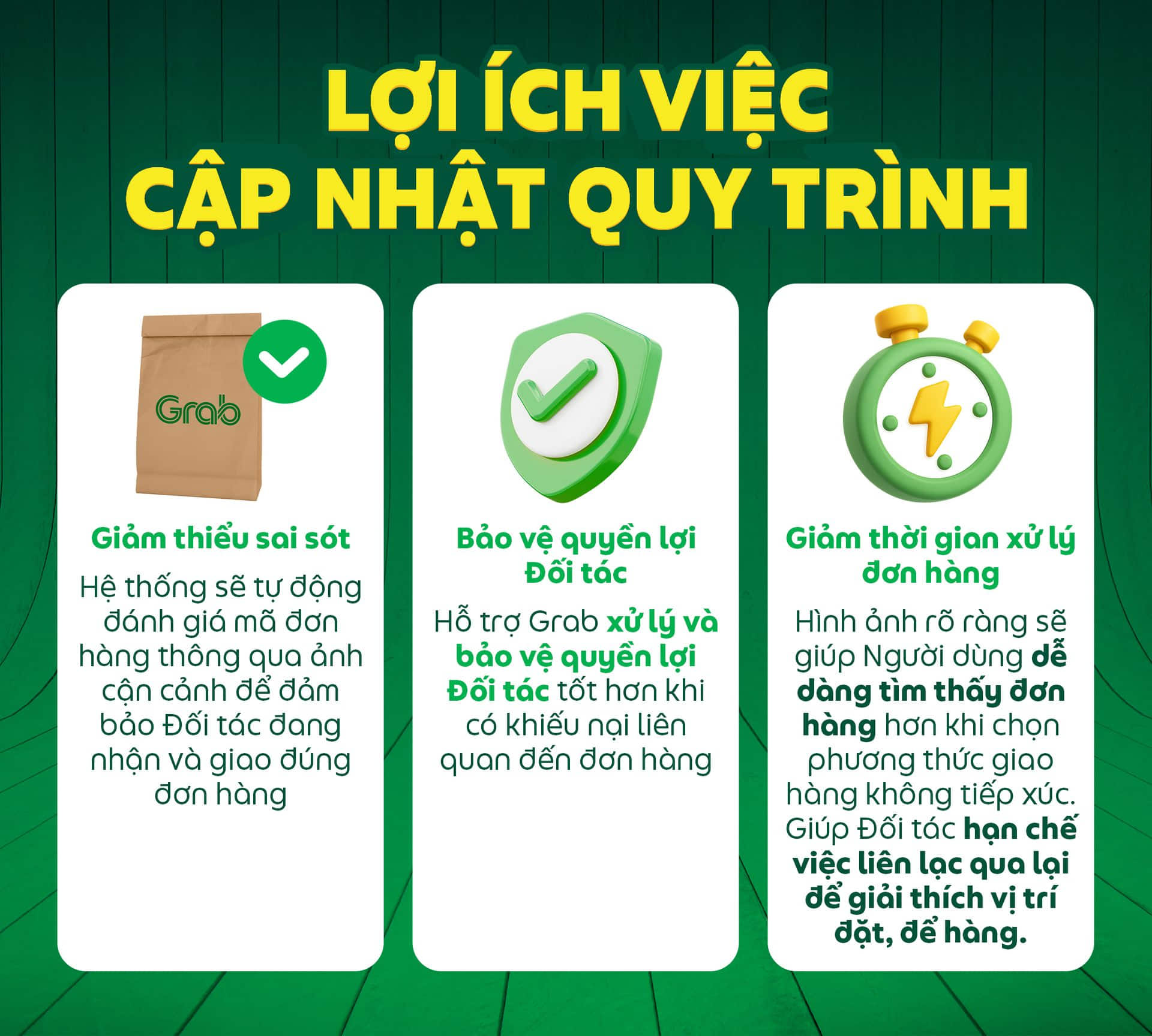 Đây là quy trình bắt buộc phải thực hiện. Grab khuyến khích Đối tác tuân thủ quy trình chụp ảnh xác nhận giao đơn hàng để đảm bảo quyền lợi và nhận được hỗ trợ tốt hơn trong quá trình giải quyết tranh chấp (nếu có).