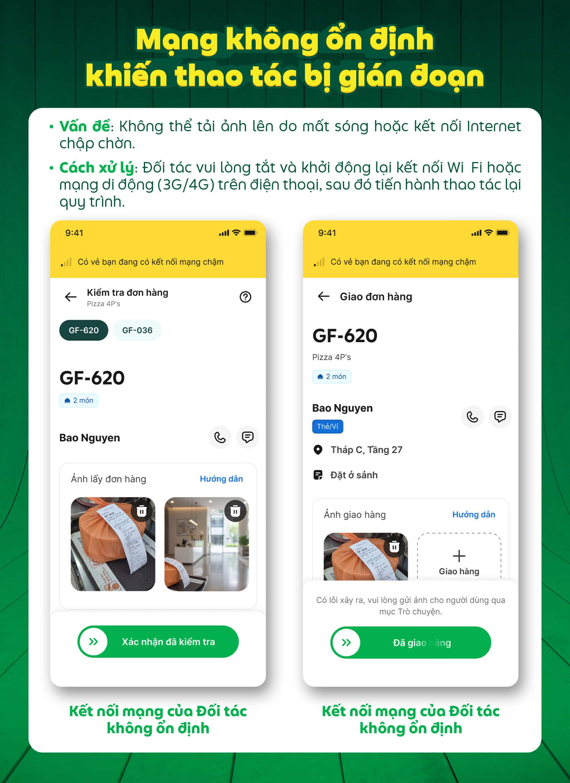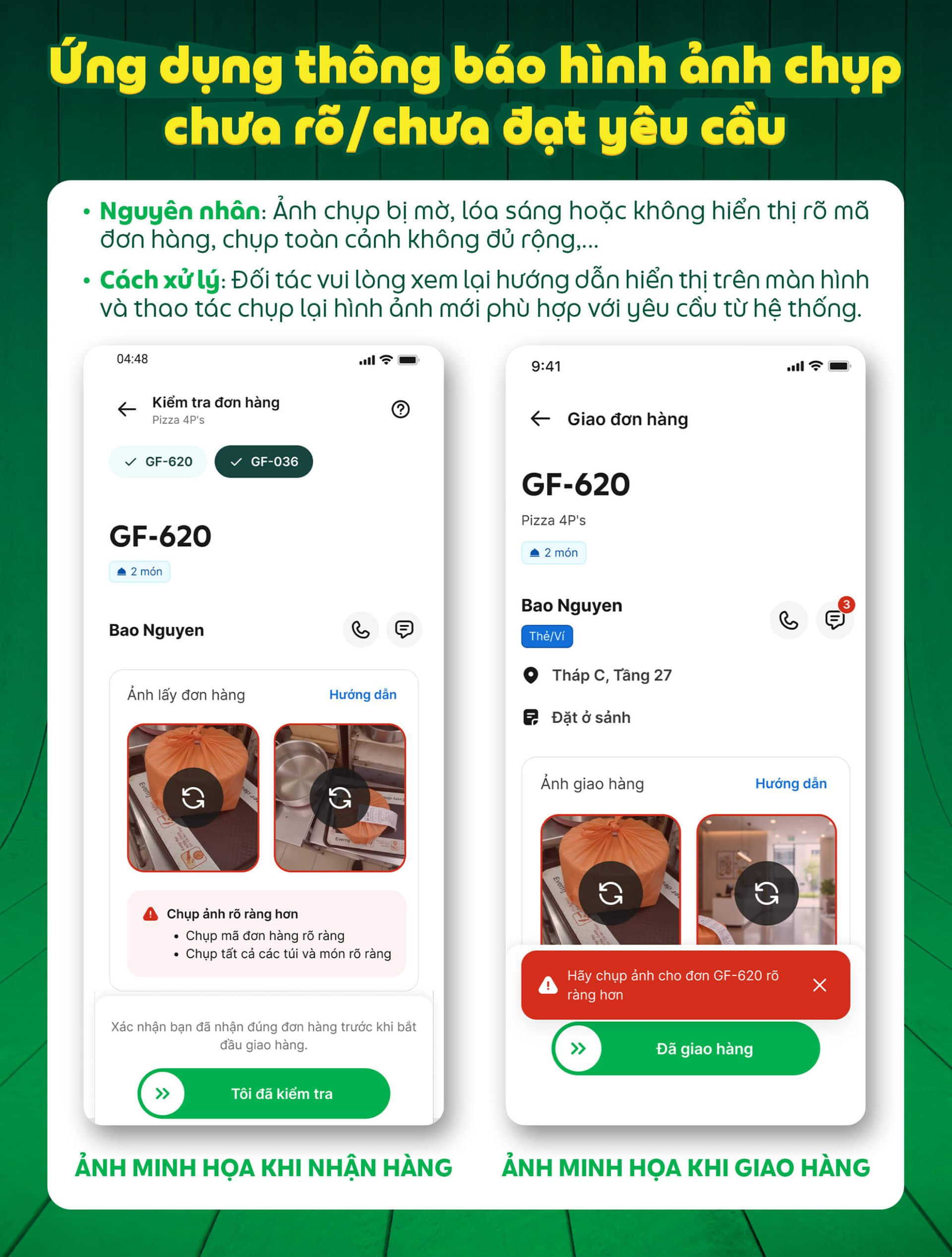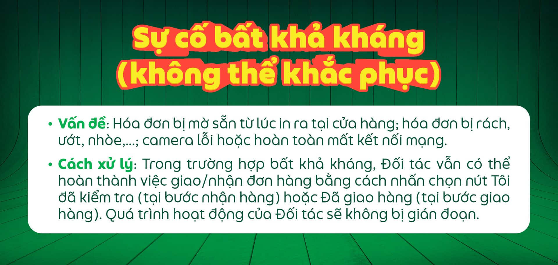 Trong trường hợp bất khả kháng, nếu điện thoại của Đối tác gặp sự cố, không thể chụp ảnh, Đối tác có thể chụp ảnh xác nhận giao đơn hàng rồi gửi đến Người dùng trong mục tin nhắn.