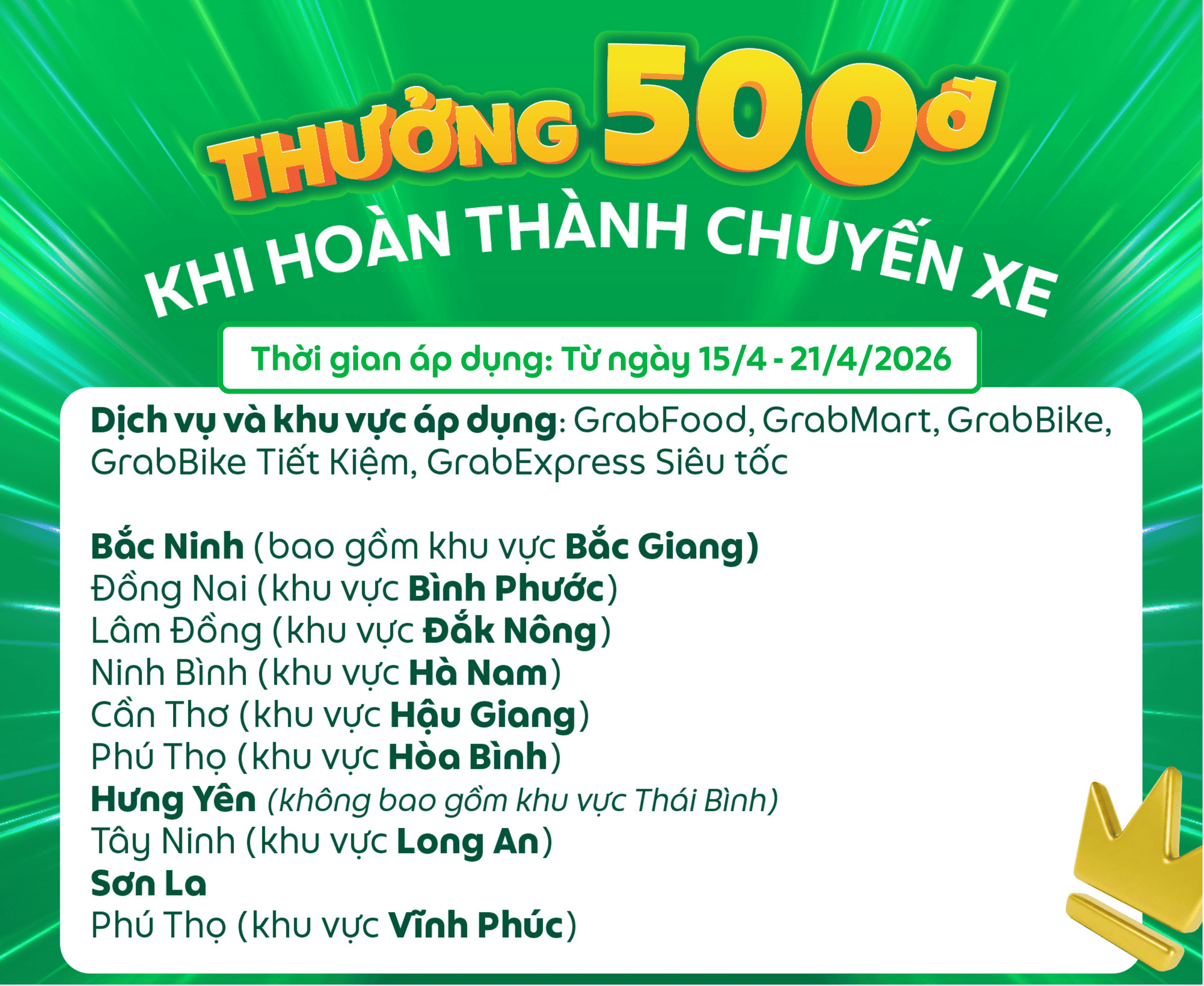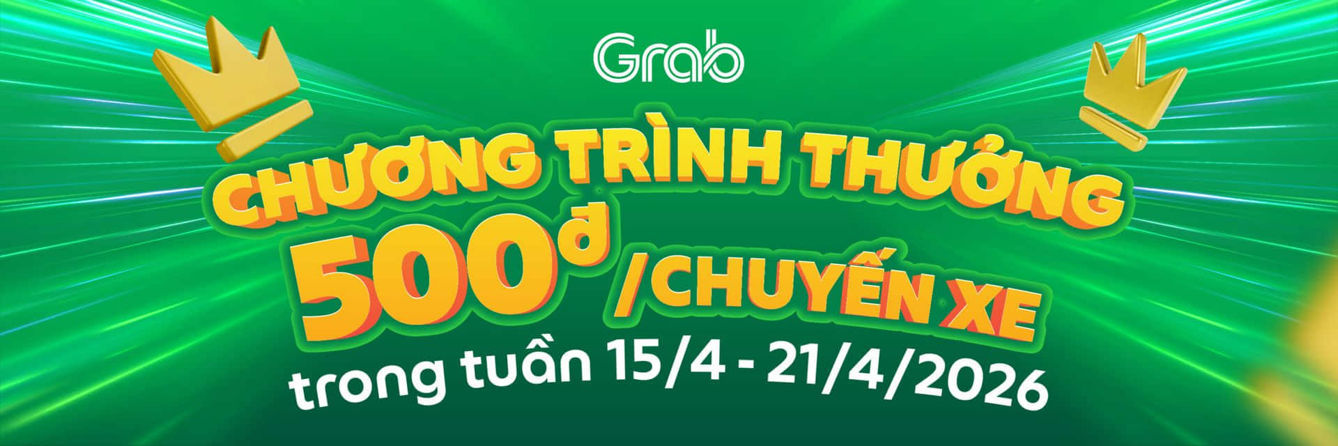 Grab triển khai chương trình thưởng khi hoàn thành chuyến xe trong tuần 01/4 – 07/4/2026 tại một số khu vực với chi tiết chương trình: